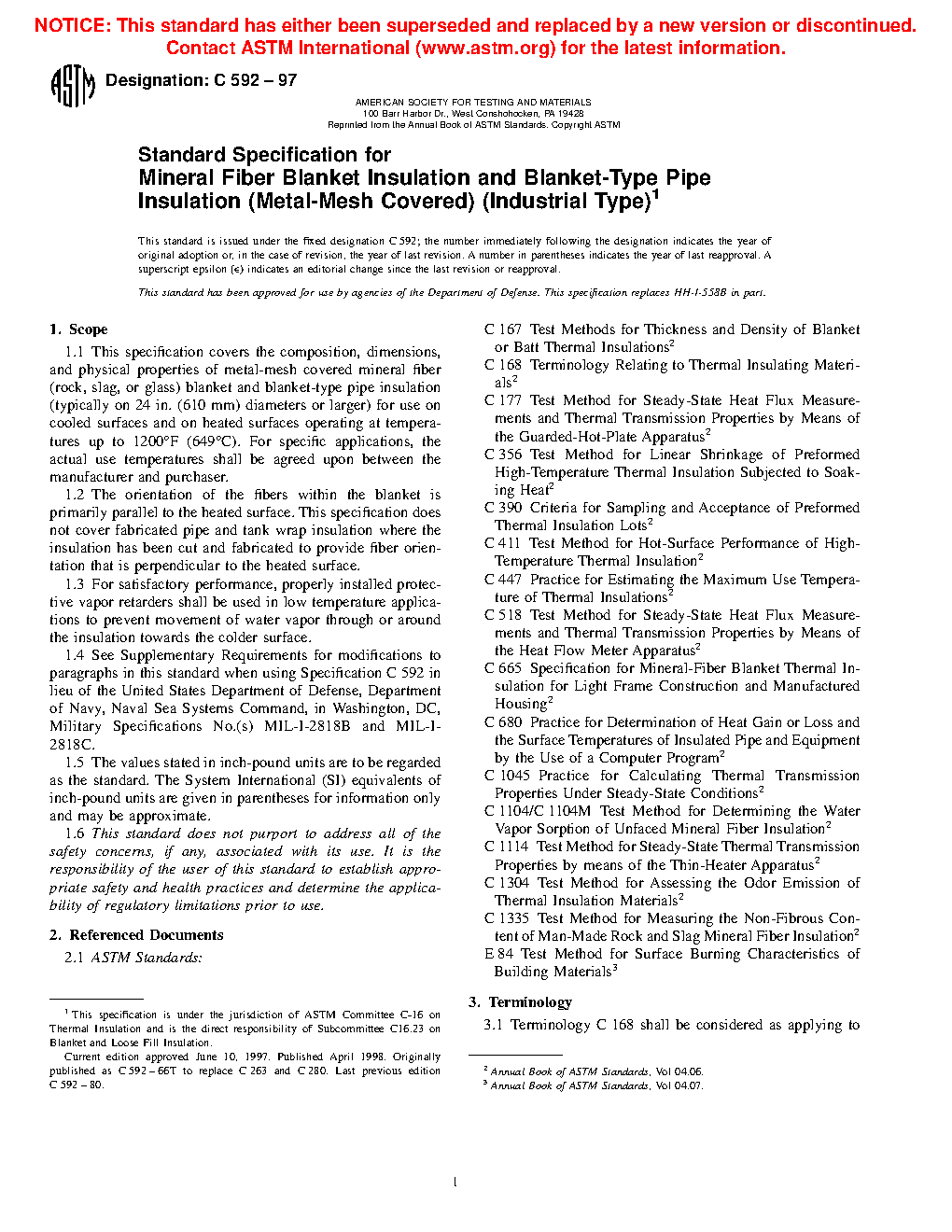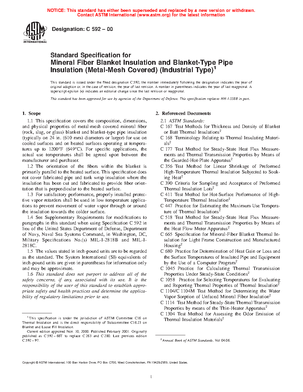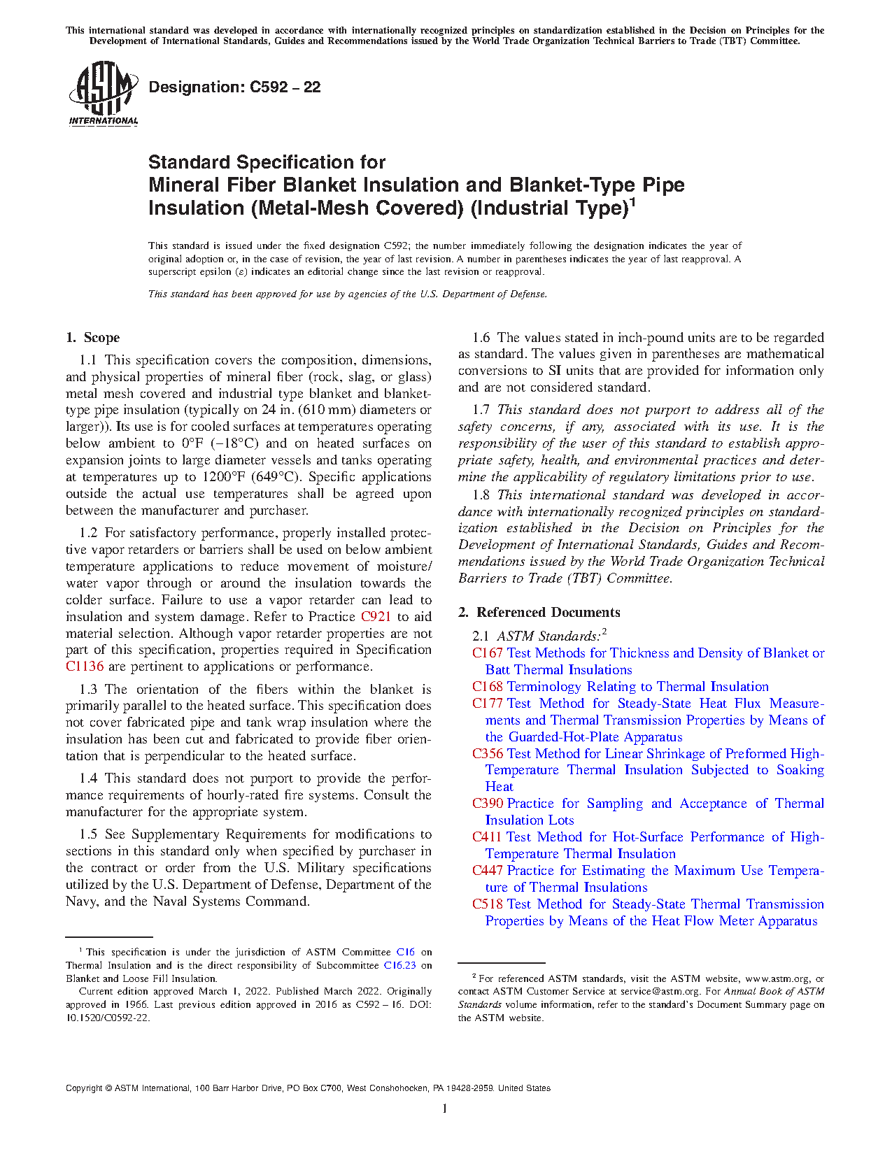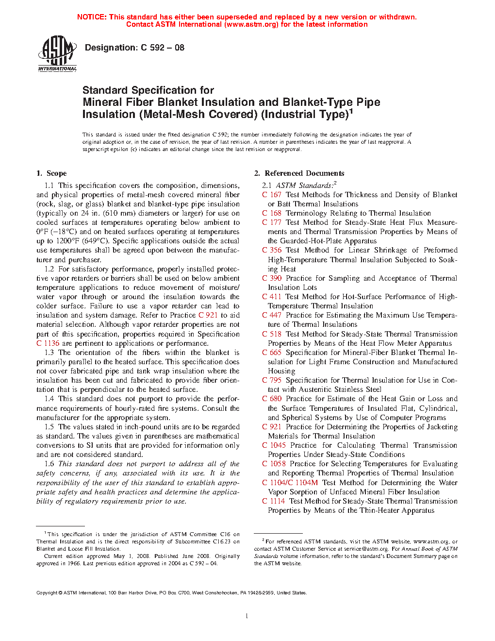 1.1 This specification covers the composition, dimensions, and physical properties of mineral fiber (rock, slag, or glass) metal mesh covered and industrial type blanket and blanket-type pipe insulation (typically on 24 in. (610 mm) diameters or larger)). Its use is for cooled surfaces at temperatures operating below ambient to 0°F (-18°C) and on heated surfaces on expansion joints to large diameter vessels and tanks operating at temperatures up to 1200°F (649°C). Specific applications outside the actual use temperatures shall be agreed upon between the manufacturer and purchaser.