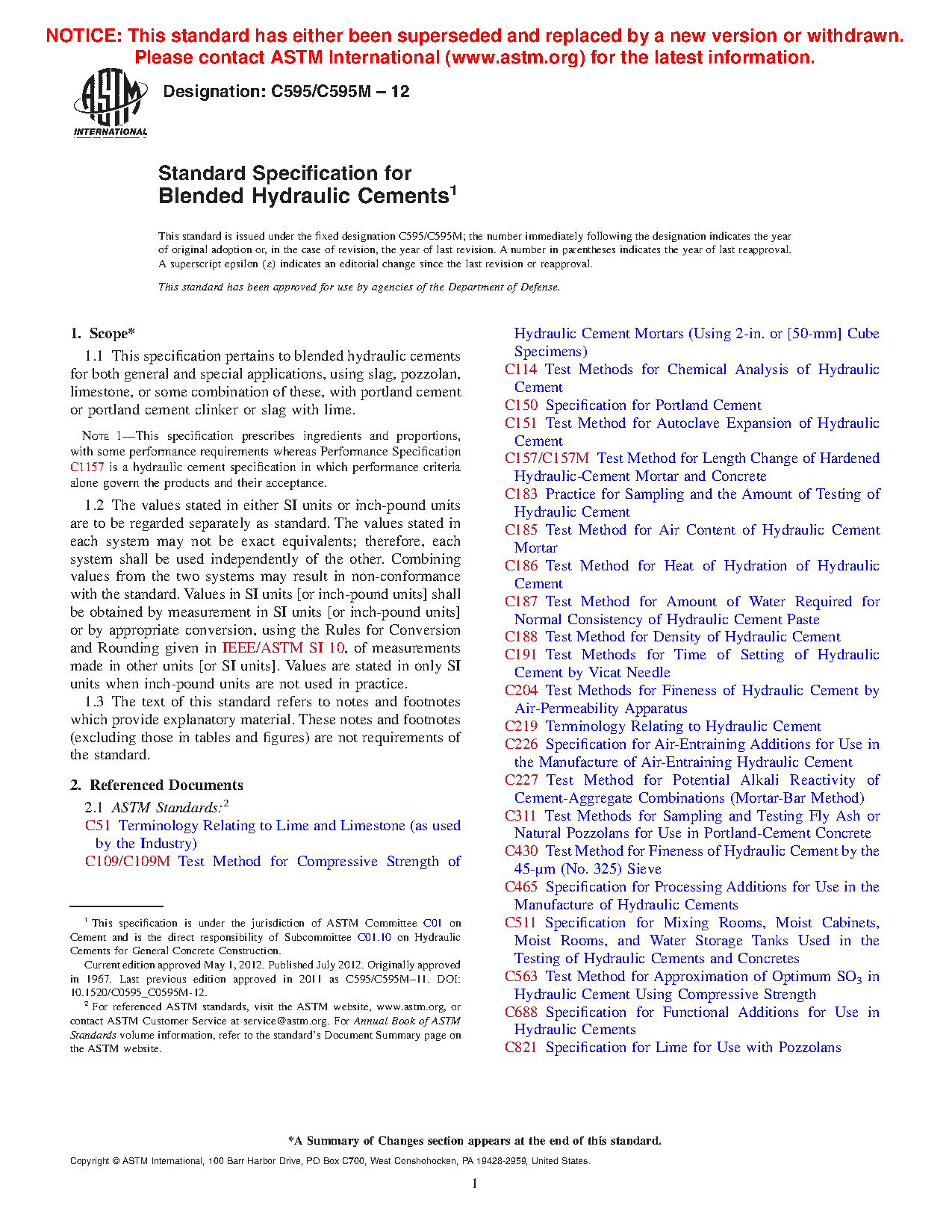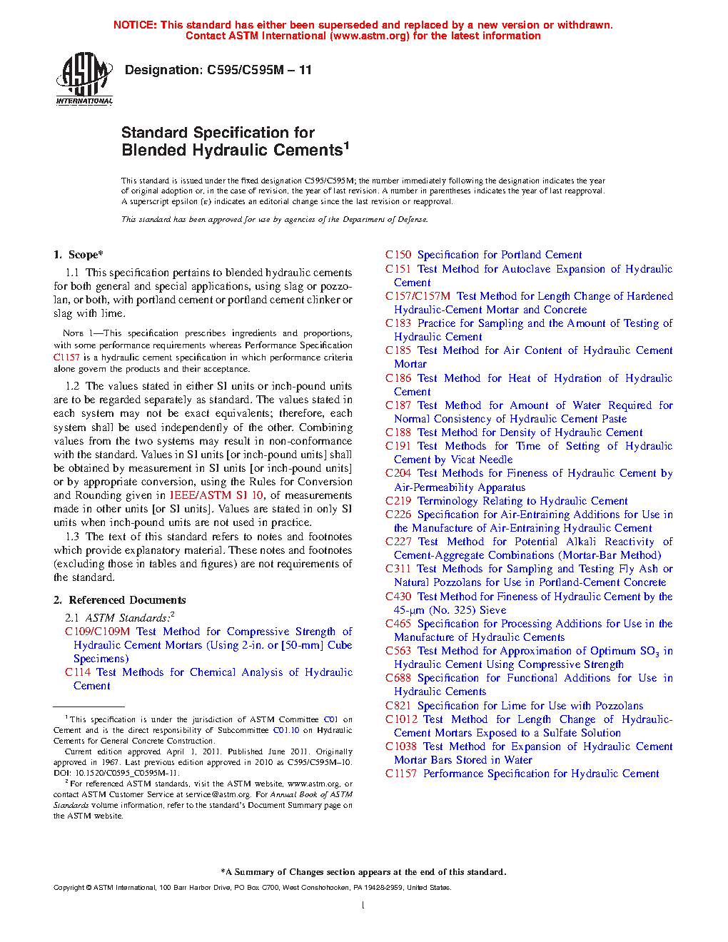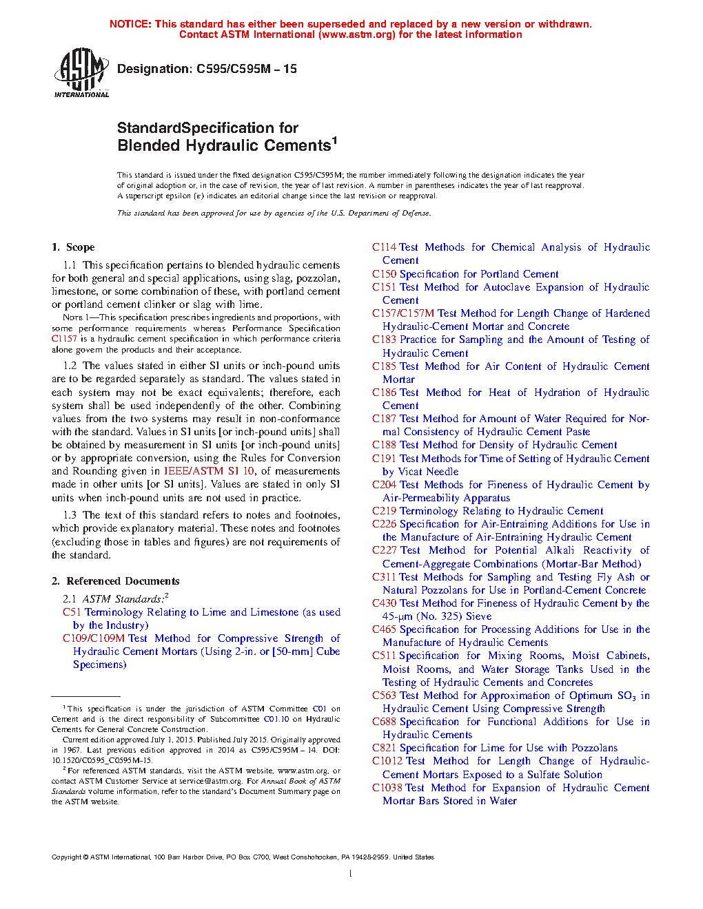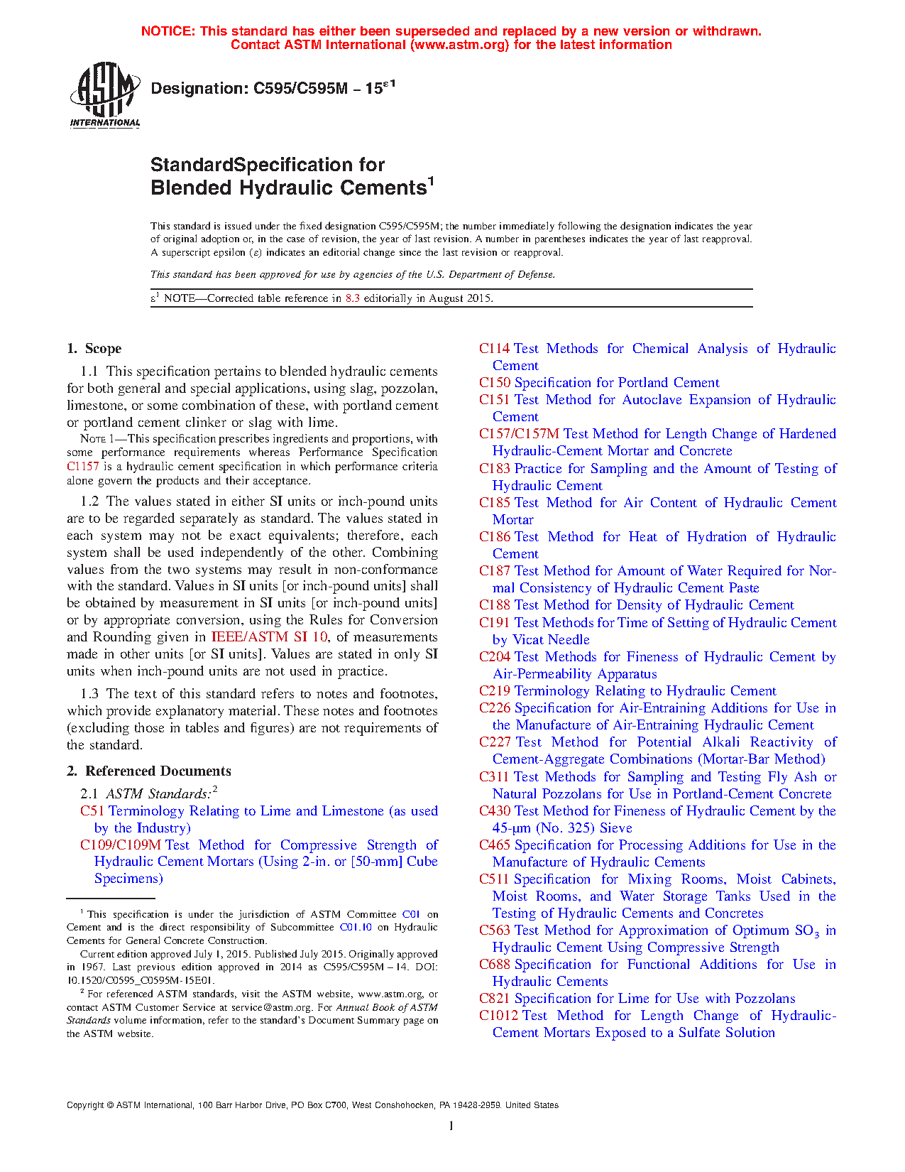 1.1 This specification pertains to blended hydraulic cements for both general and special applications, using slag, pozzolan, limestone, or some combination of these, with portland cement or portland cement clinker or slag with lime.