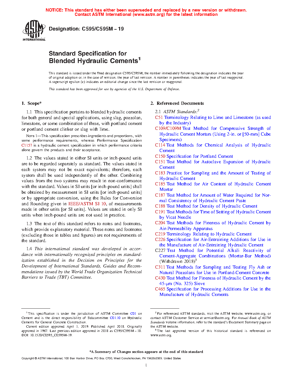 This specification pertains to blended hydraulic cements for both general and special applications, using slag or pozzolan, or both, with portland cement or portland cement clinker or slag with lime. These cements are classified into two types: Type IS which is portland blast-furnace slag cement and Type IP which is portland-pozzolan cement. They can also be described according to air-entraining, moderate sulfate resistance, moderate heat of hydration, high sulfate resistance, or low heat of hydration properties. The cement shall conform to the chemical requirements prescribed. In addition, the cement shall undergo different tests to determine the following properties: chemical analysis, fineness by sieving, fineness by air-permeability, autoclave expansion, time of setting, air content of mortar, compressive strength, heat of hydration, normal consistency, specific gravity, water requirement, mortar expansions of blended cement and pozzolan, drying shrinkage, activity index with Portland cement, and sulfate resistance.