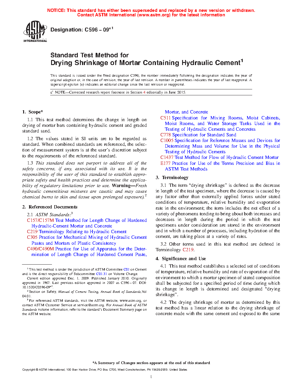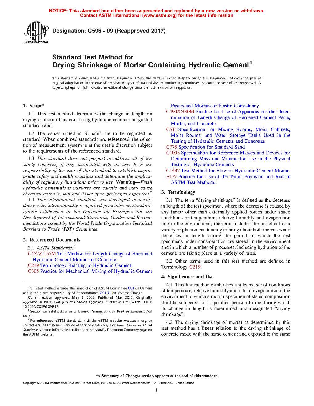 4.1 This test method establishes a selected set of conditions of temperature, relative humidity and rate of evaporation of the environment to which a mortar specimen of stated composition shall be subjected for a specified period of time during which its change in length is determined and designated “drying shrinkage”.