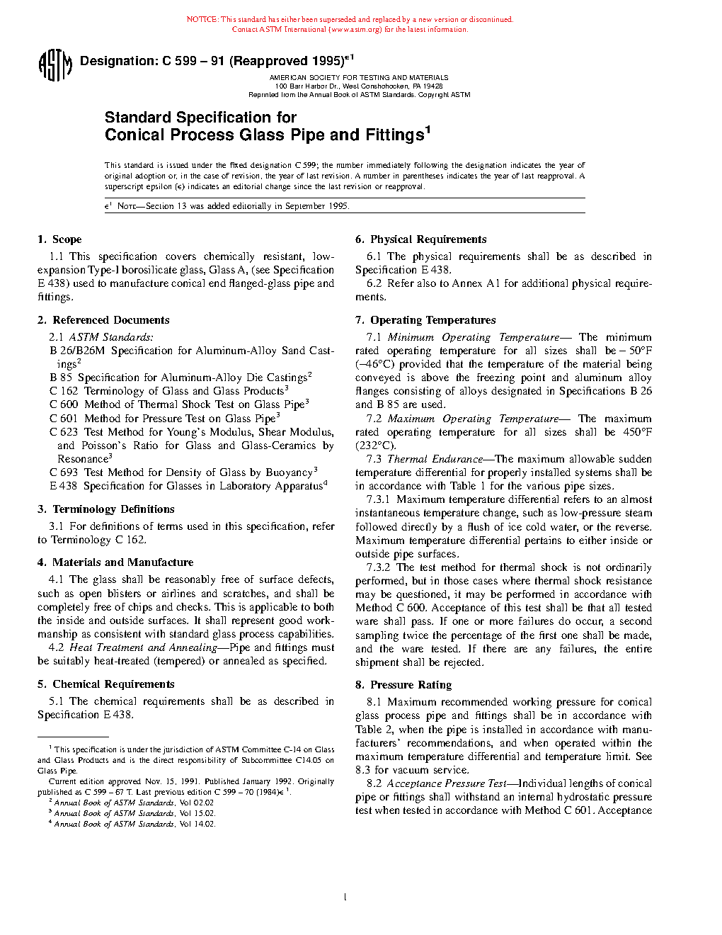 1.1 This specification covers chemically resistant, low-expansion Type-I borosilicate glass, Glass A, (see Specification E438) used to manufacture conical end flanged-glass pipe and fittings.