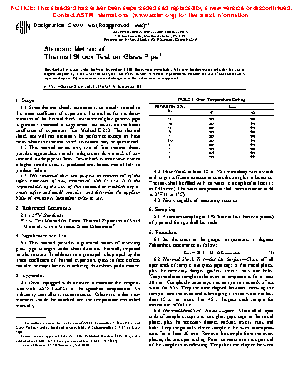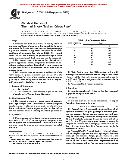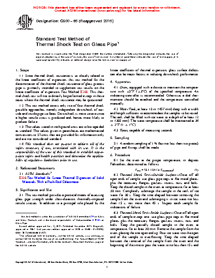 1.1 Since thermal shock resistance is so closely related to the linear coefficient of expansion, this test method for the determination of the thermal shock resistance of glass process pipe is primarily intended to supplement test results on the linear coefficient of expansion, Test Method E228. This thermal shock test will not ordinarily be performed except in those cases where the thermal shock resistance may be questioned.