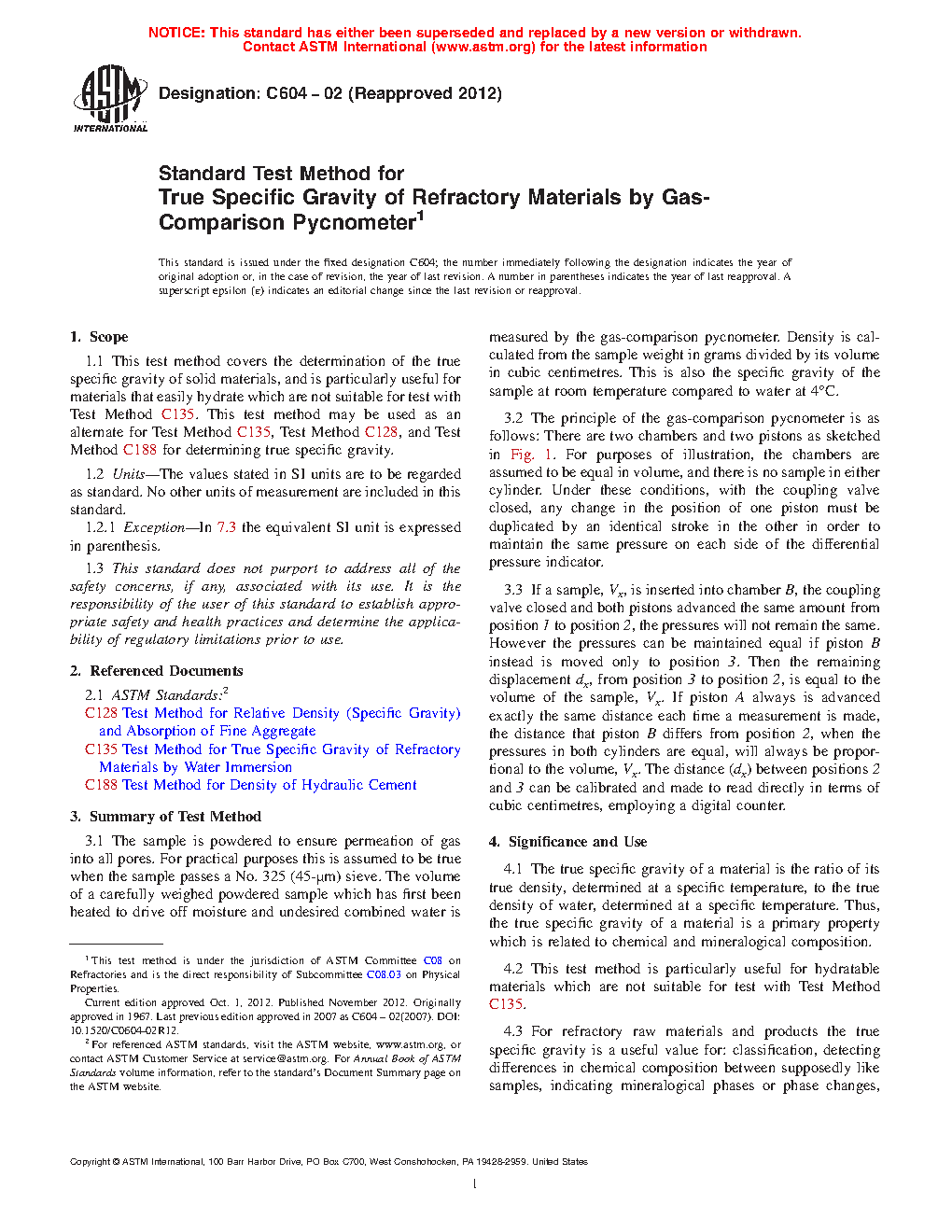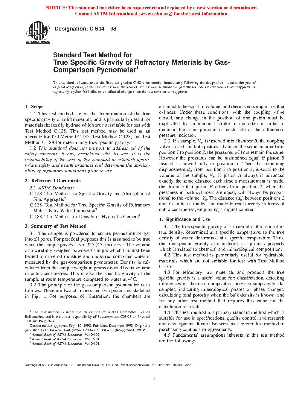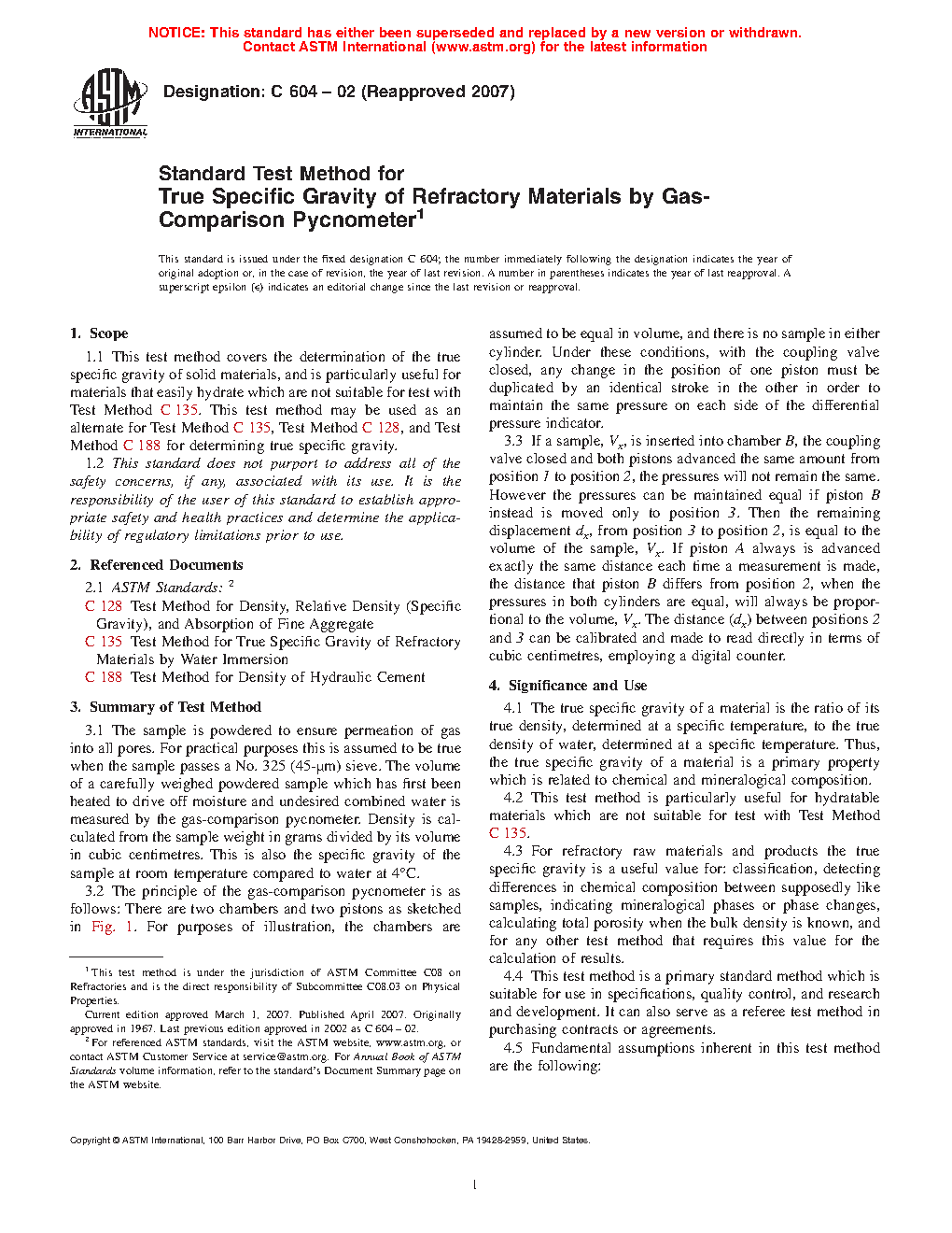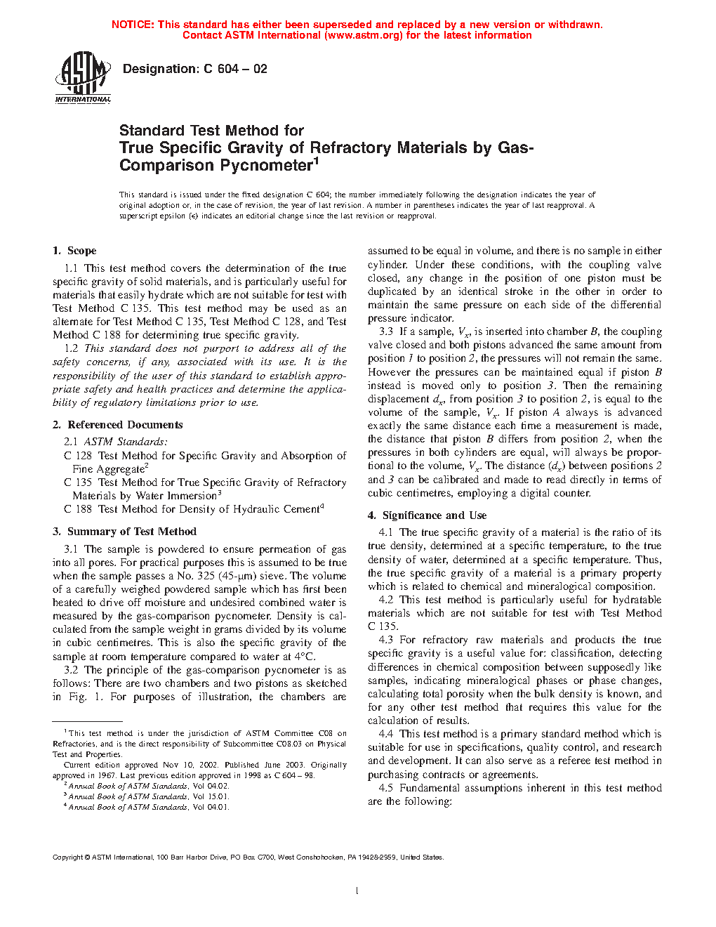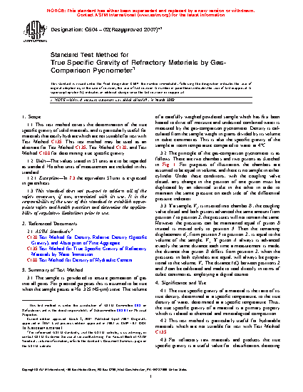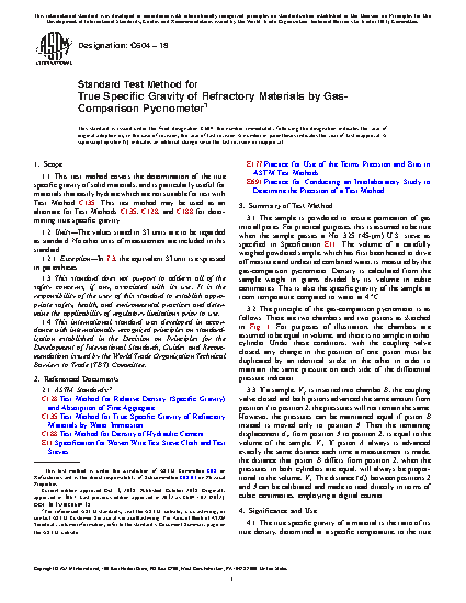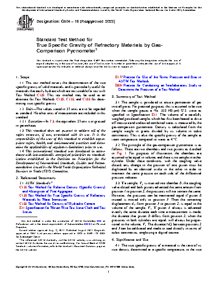 1.1 This test method covers the determination of the true specific gravity of solid materials, and is particularly useful for materials that easily hydrate which are not suitable for test with Test Method C135. This test method may be used as an alternate for Test Methods C135, C128, and C188 for determining true specific gravity.