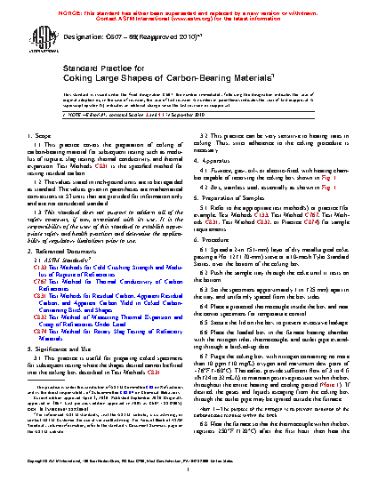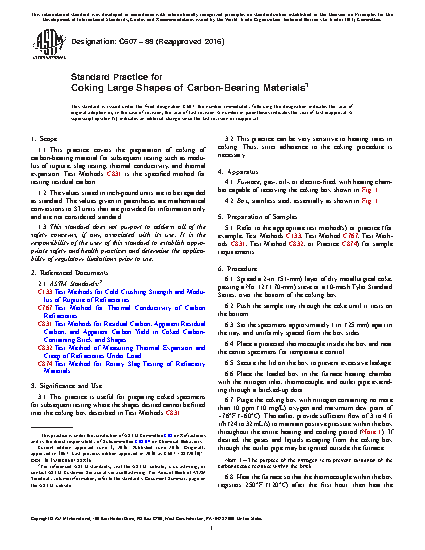 1.1 This practice covers the preparation of coking of carbon-bearing material for subsequent testing such as modulus of rupture, slag testing, thermal conductivity, and thermal expansion. Test Methods C831 is the specified method for testing residual carbon.