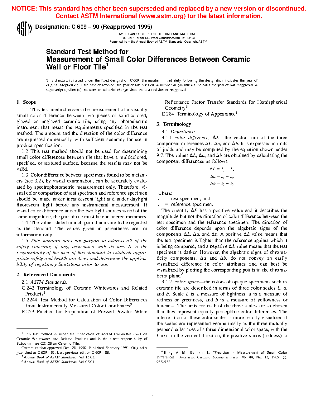 1.3 For solid colored tile, a comparison of the test specimen and reference specimen should be made under incandescent, fluorescent and daylight illuminant conditions. The use of multiple illuminants allows the color difference measurement to be made without the risk of wrongly accepting a match when the tiles being compared are metamers. (See 3.1.4.)