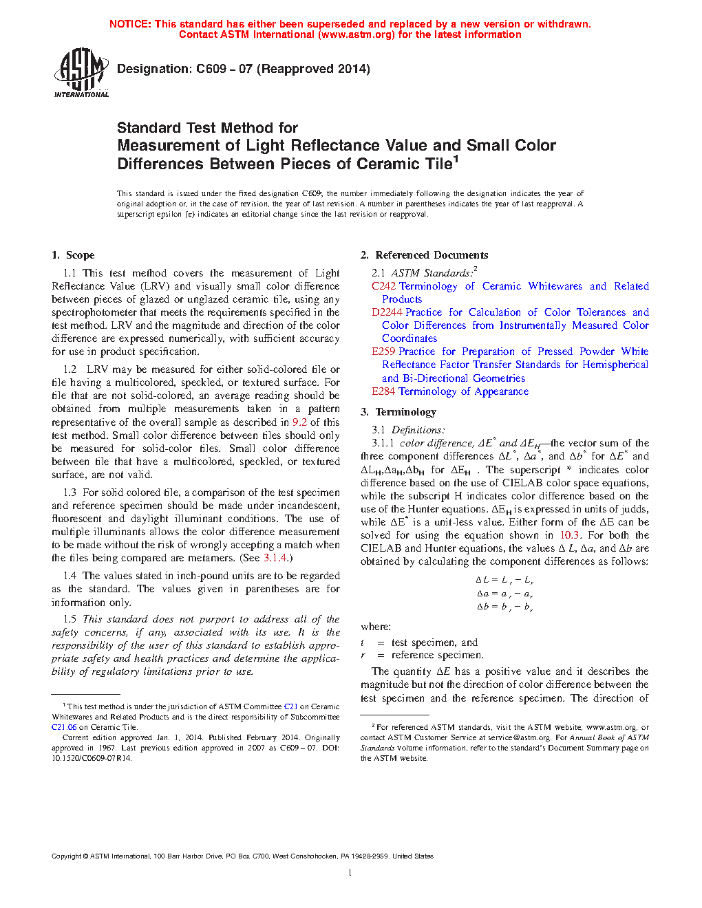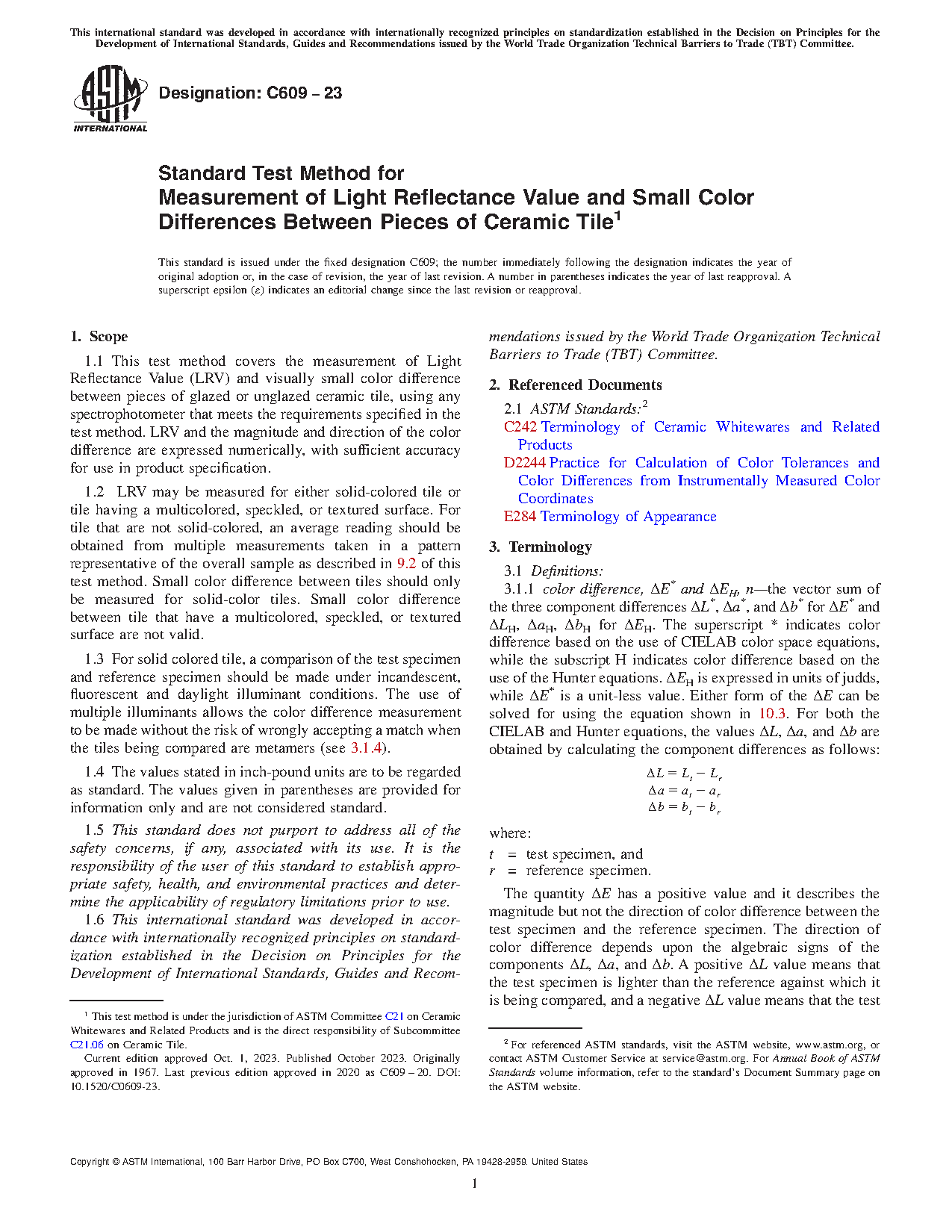 1.1 This test method covers the measurement of Light Reflectance Value (LRV) and visually small color difference between pieces of glazed or unglazed ceramic tile, using any spectrophotometer that meets the requirements specified in the test method. LRV and the magnitude and direction of the color difference are expressed numerically, with sufficient accuracy for use in product specification.