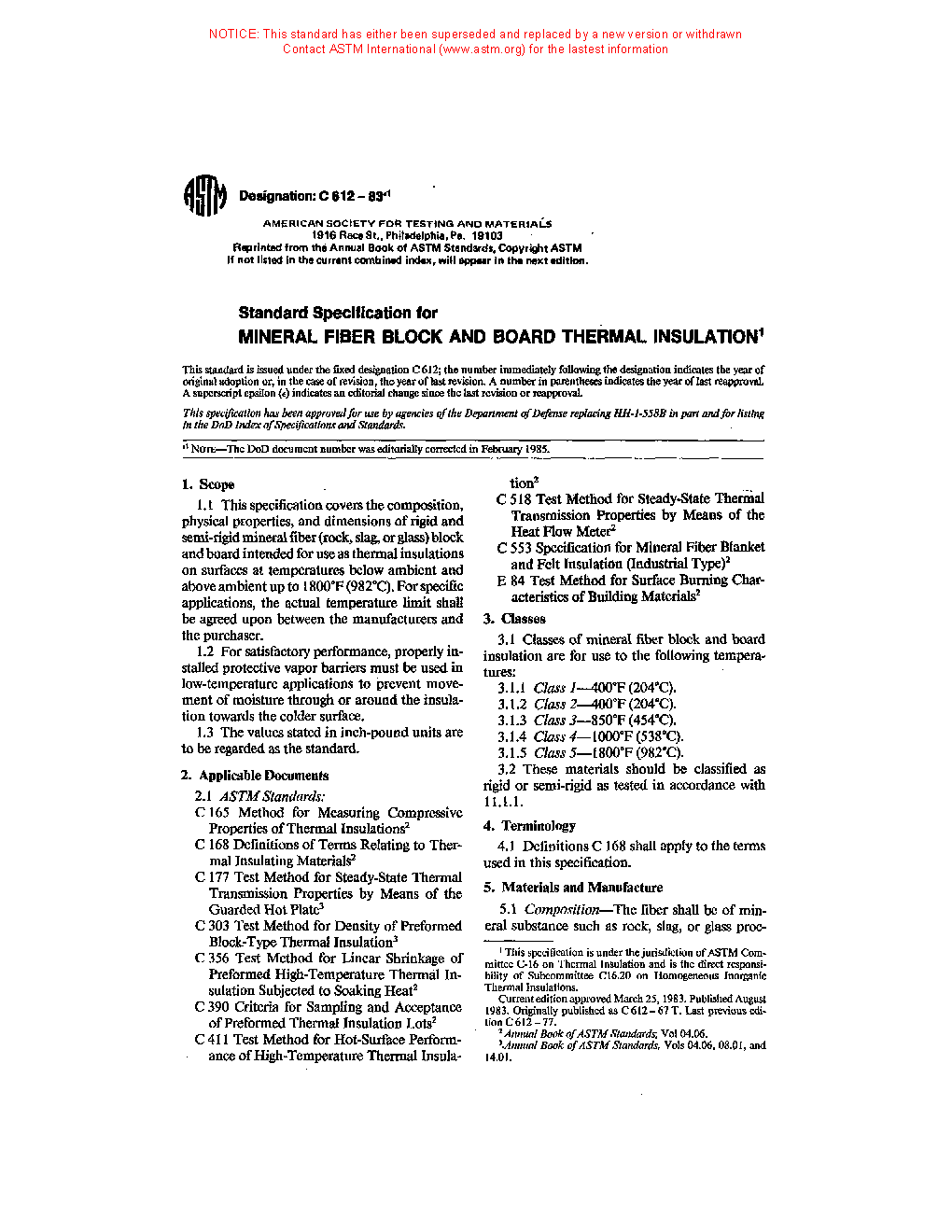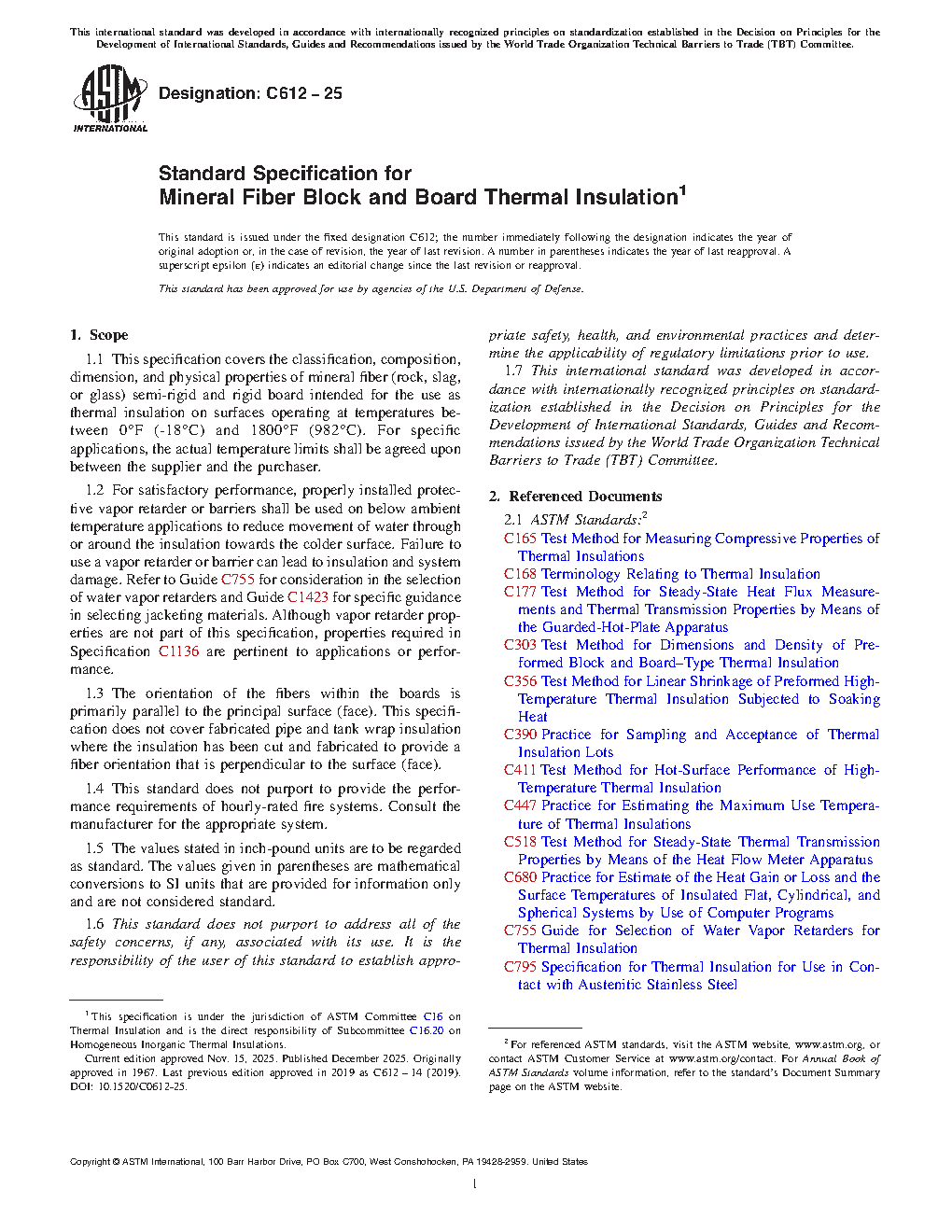 1.1 This specification covers the classification, composition, dimension, and physical properties of mineral fiber (rock, slag, or glass) semi-rigid and rigid board intended for the use as thermal insulation on surfaces operating at temperatures between 0°F (-18°C) and 1800°F (982°C). For specific applications, the actual temperature limits shall be agreed upon between the supplier and the purchaser.