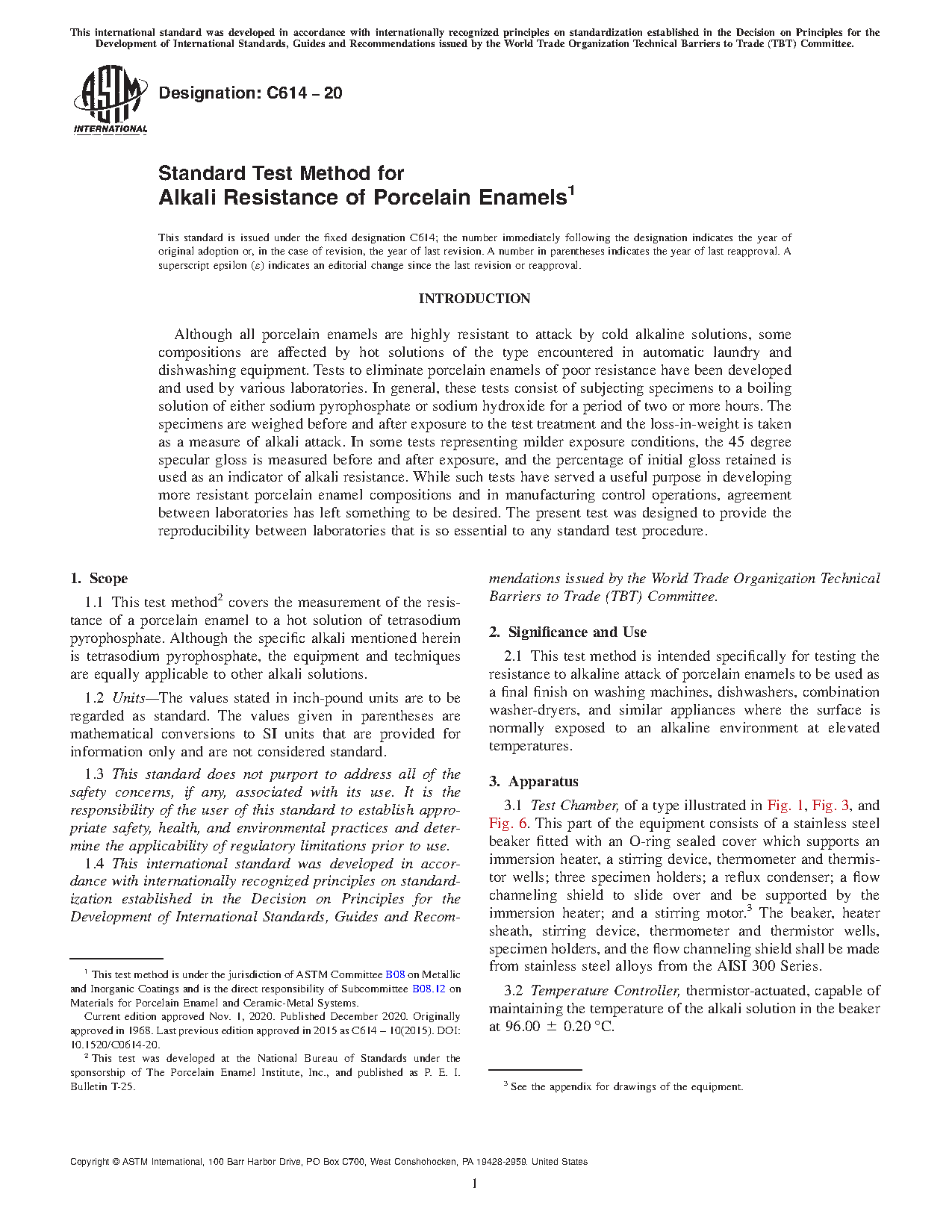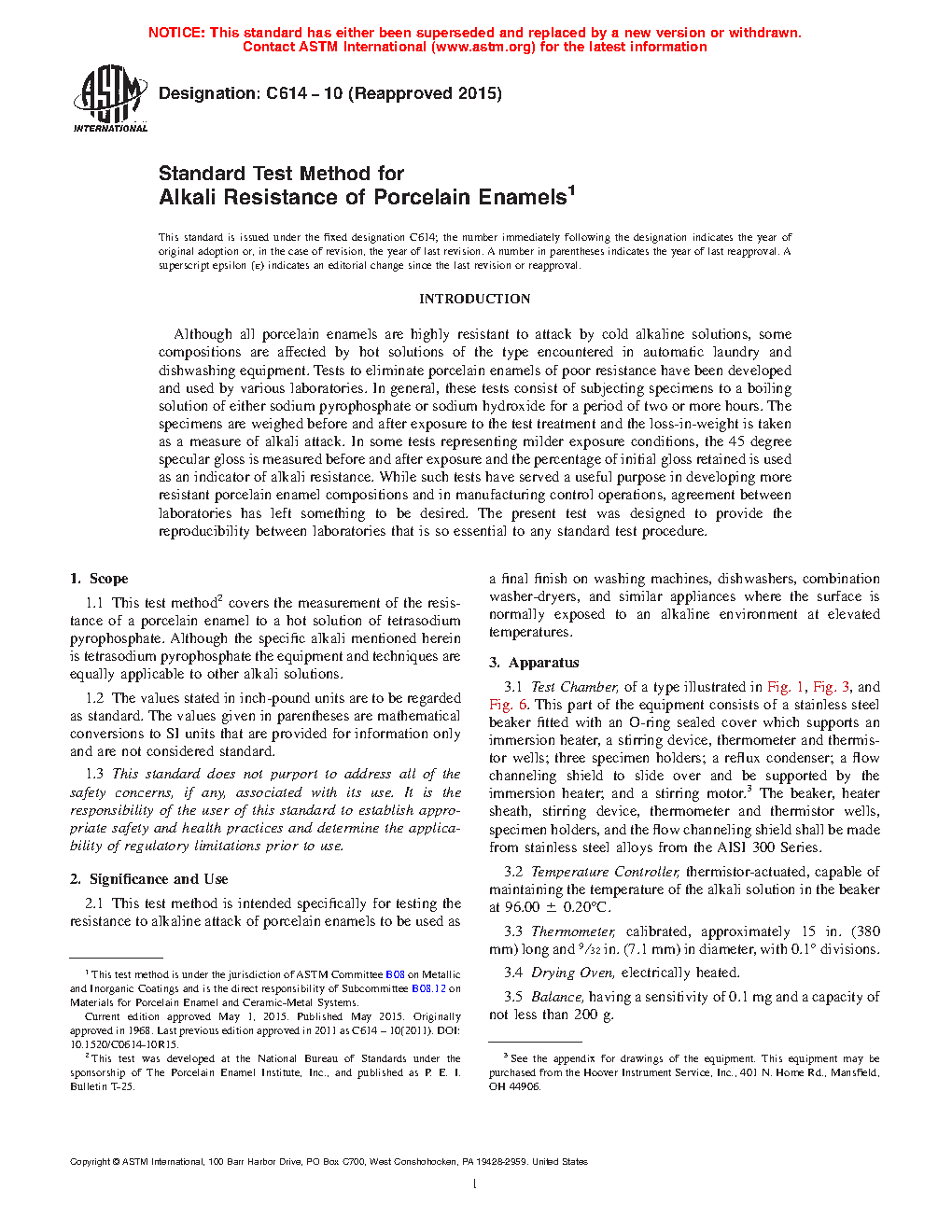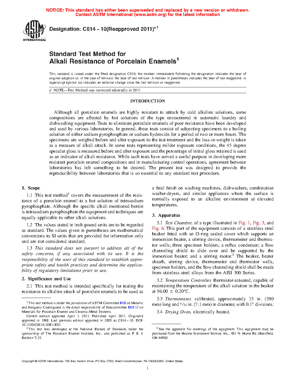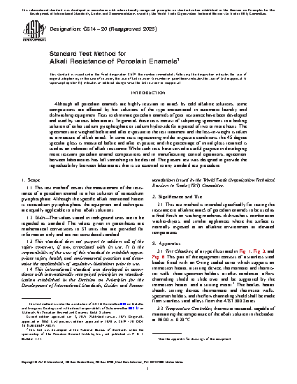 1.1 This test method2 covers the measurement of the resistance of a porcelain enamel to a hot solution of tetrasodium pyrophosphate. Although the specific alkali mentioned herein is tetrasodium pyrophosphate the equipment and techniques are equally applicable to other alkali solutions.