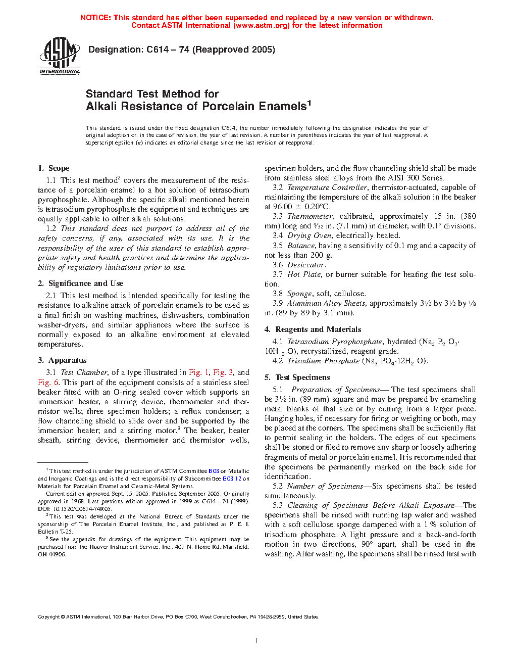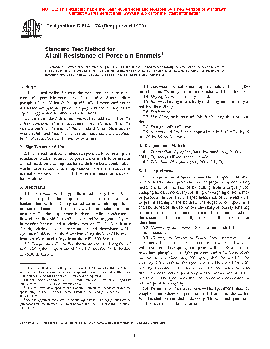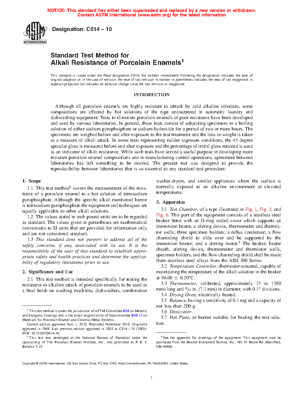1.1 This test method2 covers the measurement of the resistance of a porcelain enamel to a hot solution of tetrasodium pyrophosphate. Although the specific alkali mentioned herein is tetrasodium pyrophosphate the equipment and techniques are equally applicable to other alkali solutions.
