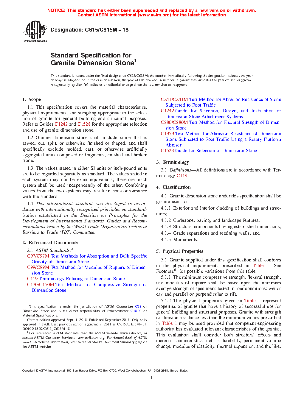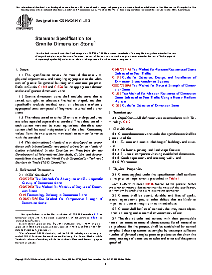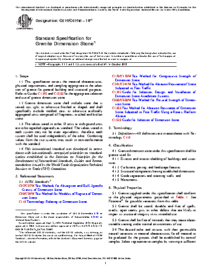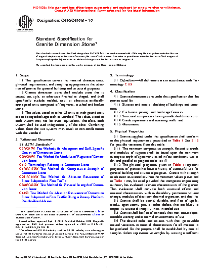 1.1 This specification covers the material characteristics, physical requirements, and sampling appropriate to the selection of granite for general building and structural purposes. Refer to Guides C1242 and C1528 for the appropriate selection and use of granite dimension stone.
