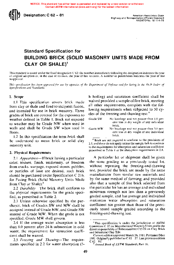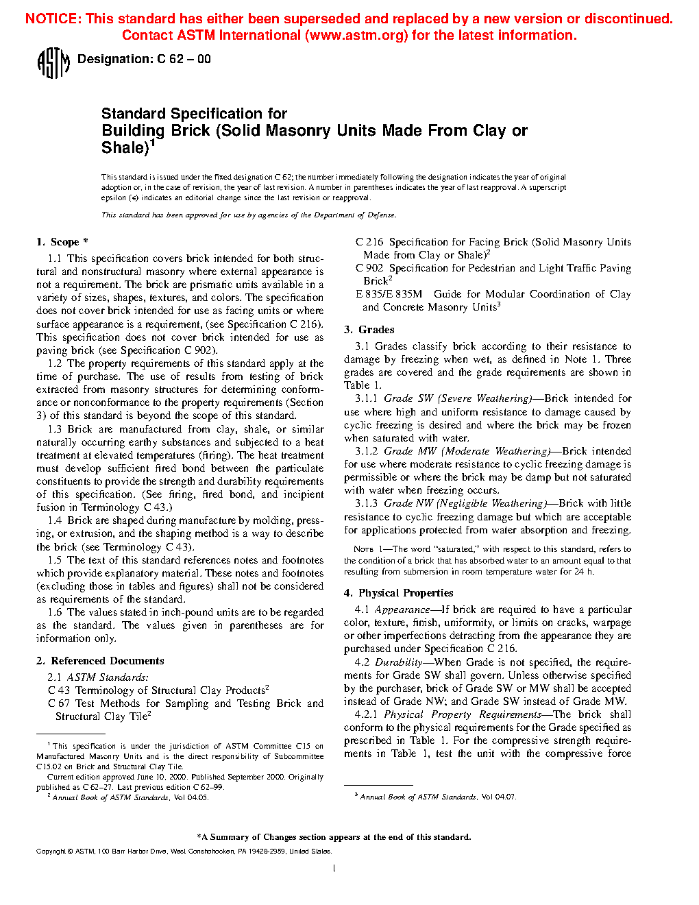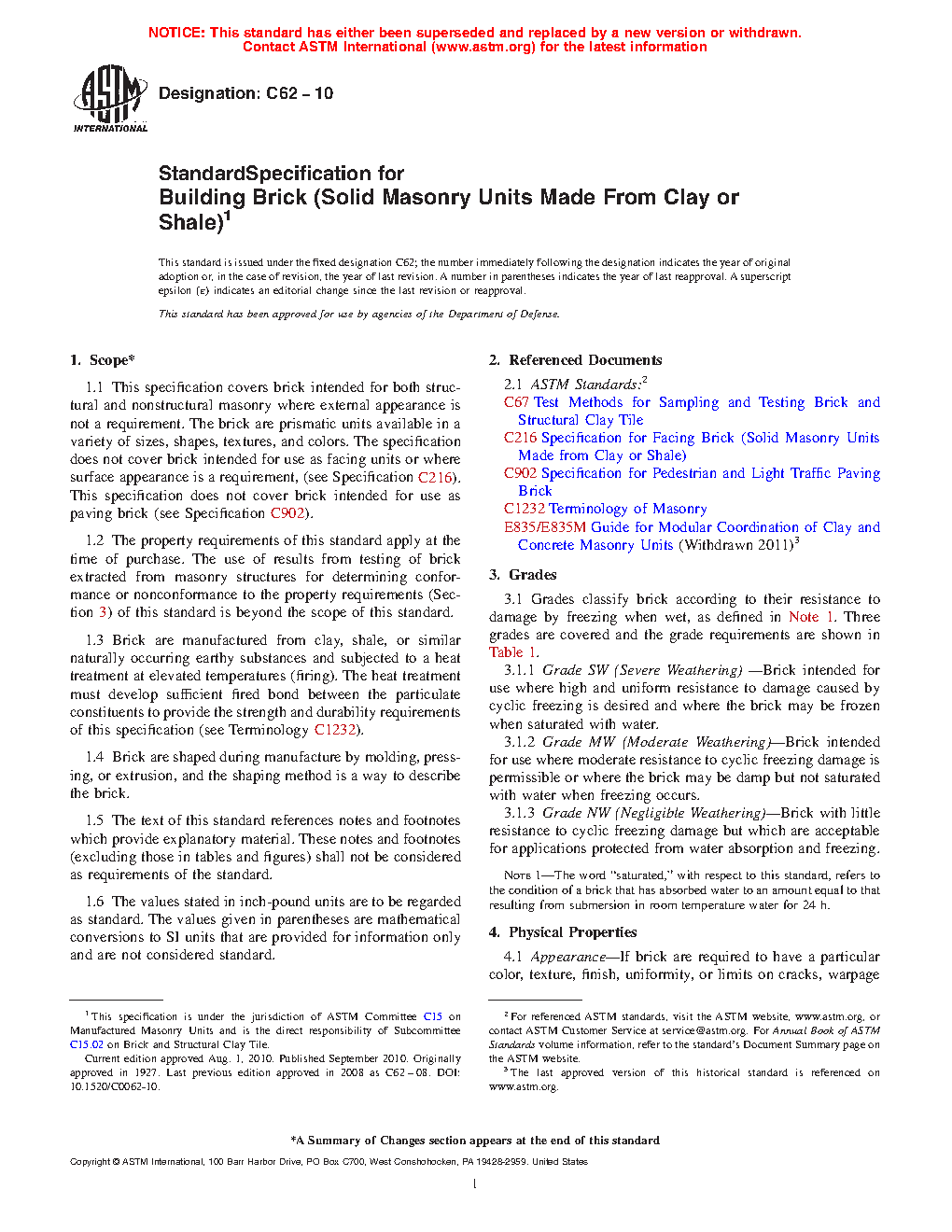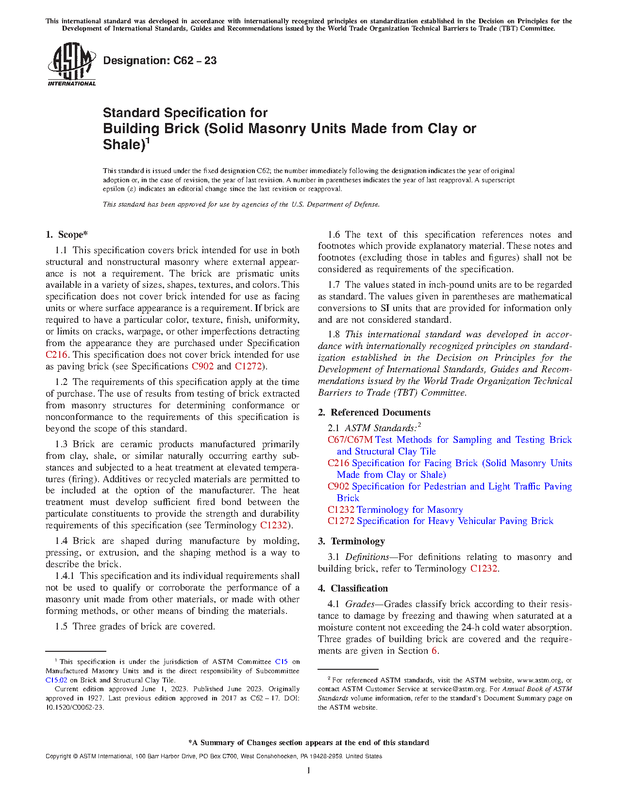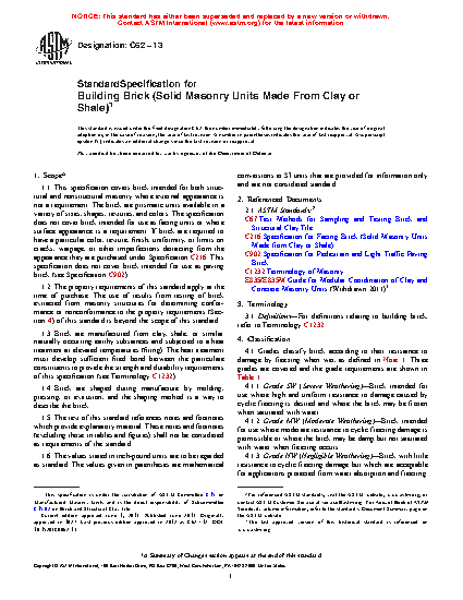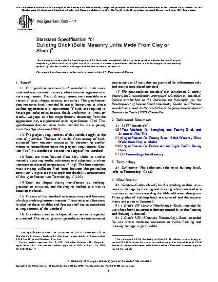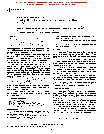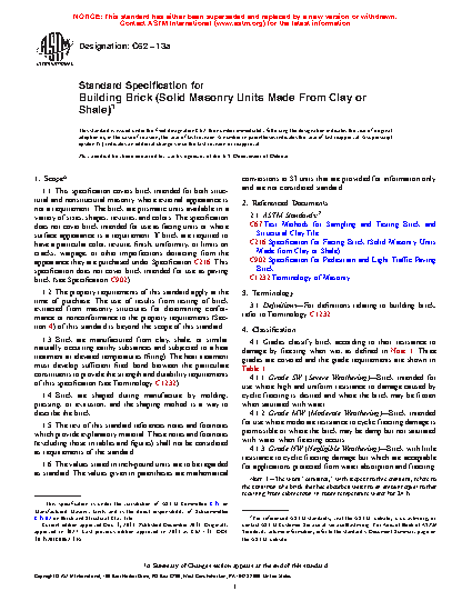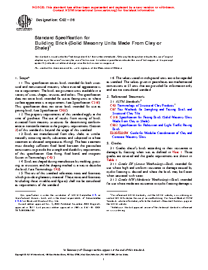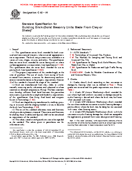 1.1 This specification covers brick intended for use in both structural and nonstructural masonry where external appearance is not a requirement. The brick are prismatic units available in a variety of sizes, shapes, textures, and colors. This specification does not cover brick intended for use as facing units or where surface appearance is a requirement. If brick are required to have a particular color, texture, finish, uniformity, or limits on cracks, warpage, or other imperfections detracting from the appearance they are purchased under Specification C216. This specification does not cover brick intended for use as paving brick (see Specifications C902 and C1272).