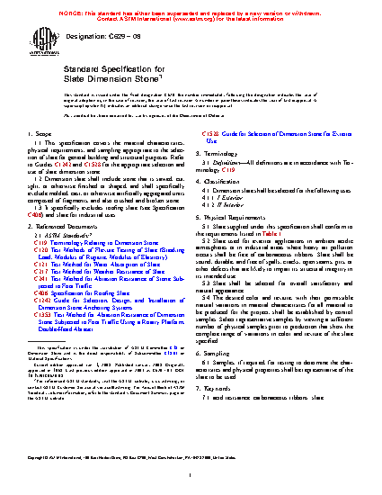 1.1 This specification covers the material characteristics, physical requirements, and sampling appropriate to the selection of slate for general building and structural purposes. Refer to Guides C1242 and C1528 for the appropriate selection and use of slate dimension stone.