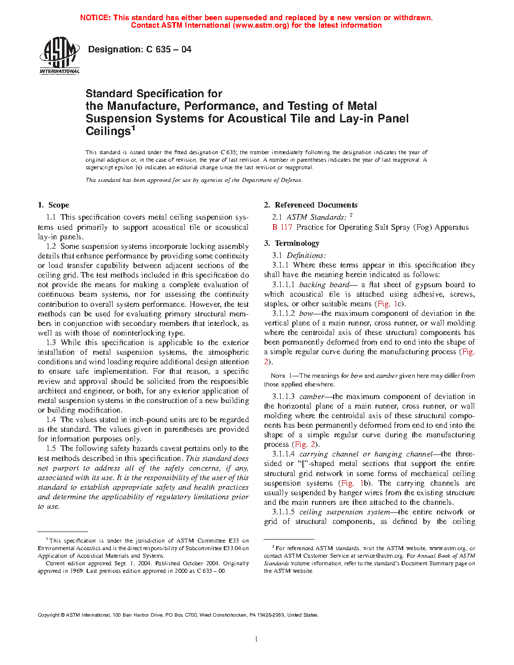1.3 While this specification is applicable to the exterior installation of metal suspension systems, the atmospheric conditions and wind loading require additional design attention to ensure safe implementation. For that reason, a specific review and approval should be solicited from the responsible architect and engineer, or both, for any exterior application of metal suspension systems in the construction of a new building or building modification.