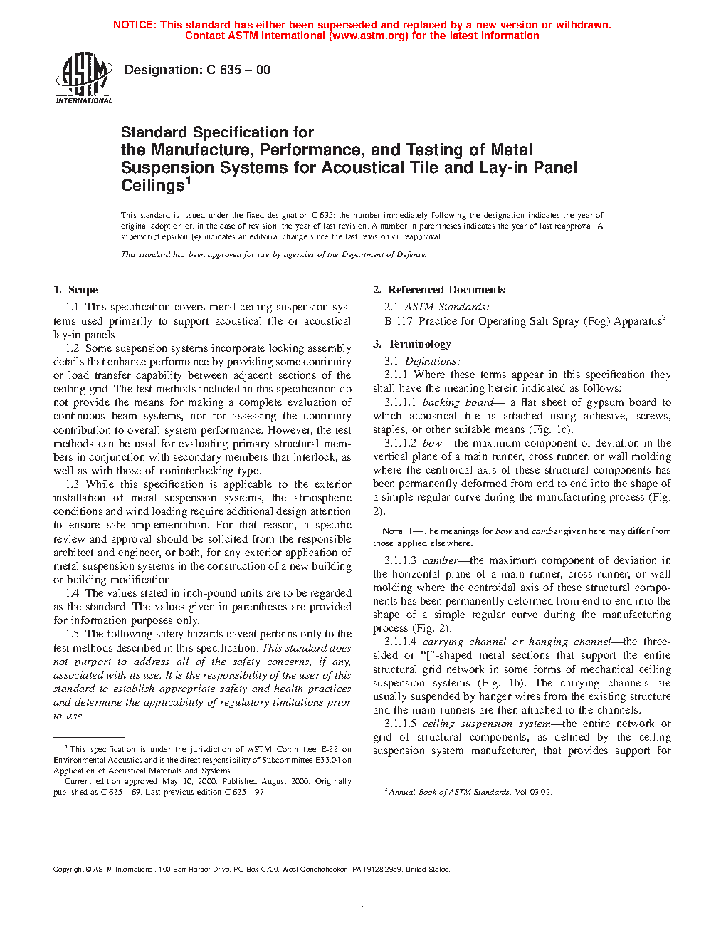 1.1 This specification covers metal ceiling suspension systems used primarily to support acoustical tile or acoustical lay-in panels.