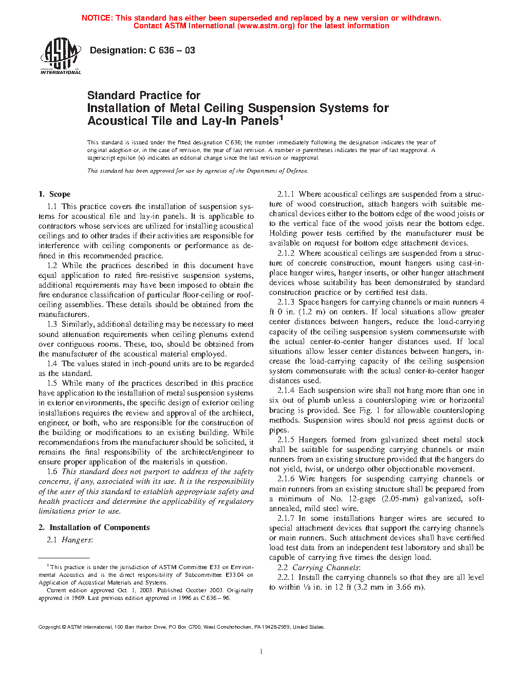 1.1 This practice covers the installation of suspension systems for acoustical tile and lay-in panels. It is applicable to contractors whose services are utilized for installing acoustical ceilings and to other trades if their activities are responsible for interference with ceiling components or performance as defined in this recommended practice.
