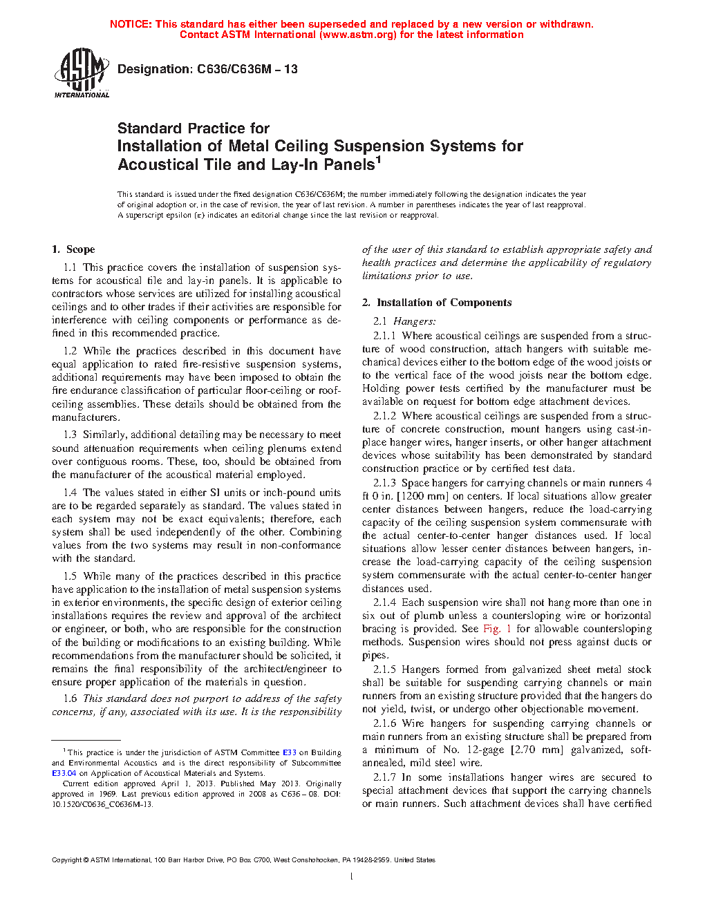 This practice covers the standard procedures for the installation of metal ceiling suspension systems for acoustical tile and lay-in panels. Here, specifications are provided for the installation of individual components such as hangers, carrying channels, main runners, cross runners, splines, assembly devices, and ceiling fixtures. Specifications are also given for possible interference of ceiling related components, and the lighting and appearance.