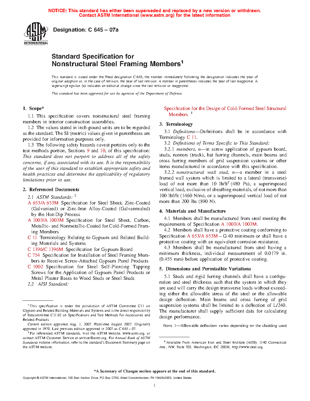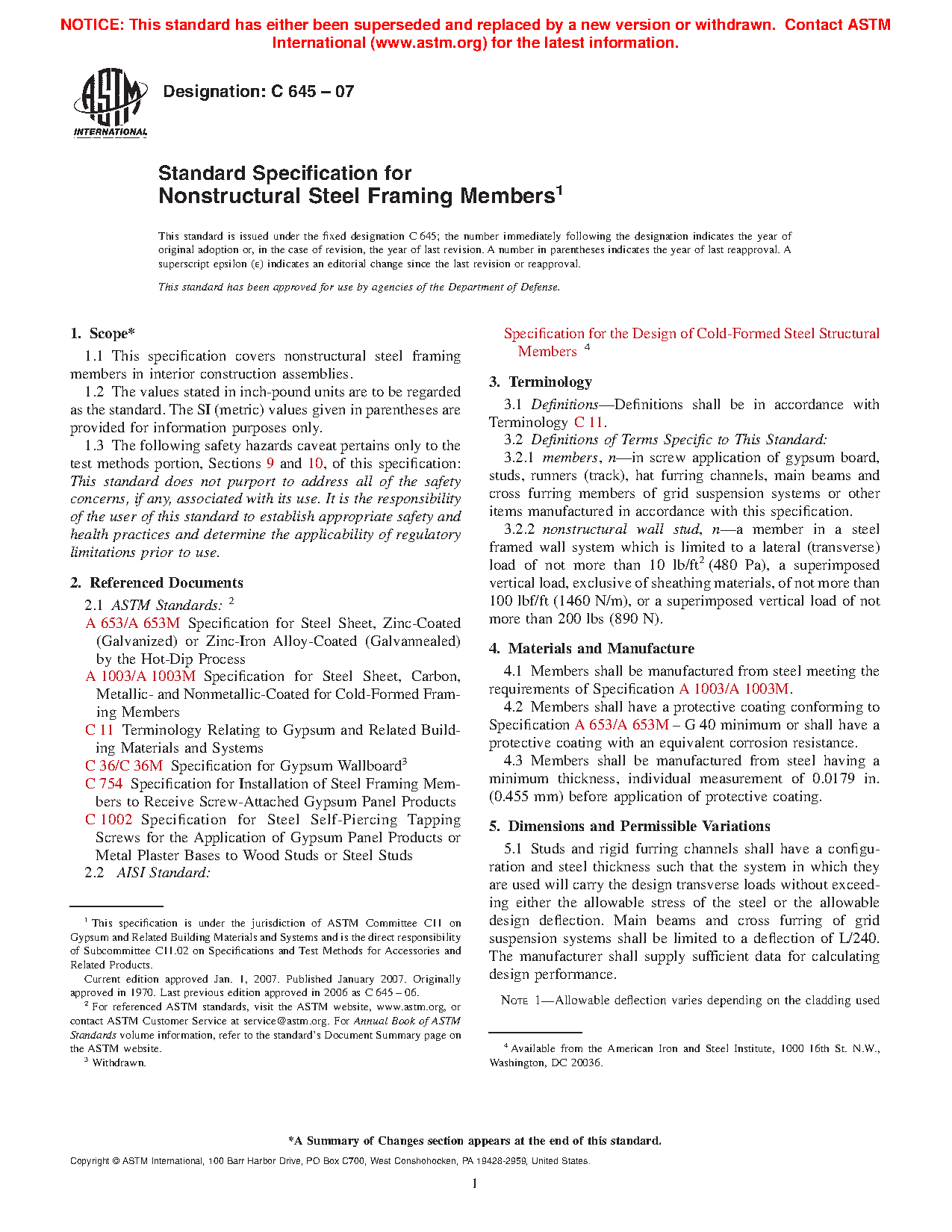1.1 This specification covers nonstructural steel framing members in interior construction assemblies.