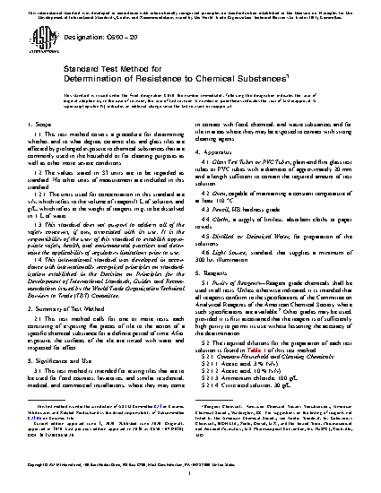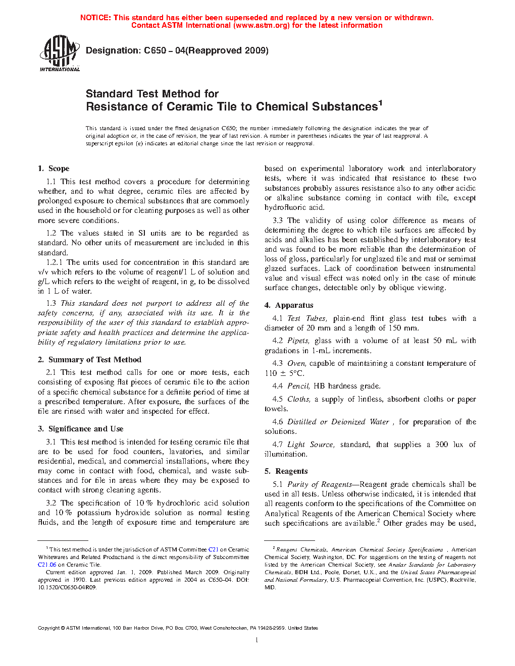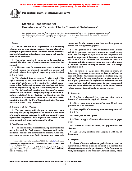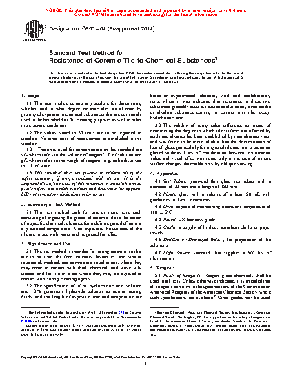1.1 This test method covers a procedure for determining whether, and to what degree, ceramic tiles and glass tiles are affected by prolonged exposure to chemical substances that are commonly used in the household or for cleaning purposes as well as other more severe conditions.