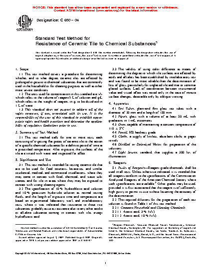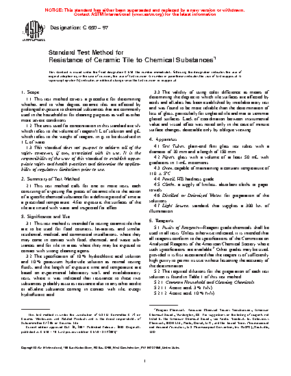 3.1 This test method is intended for testing tiles that are to be used for food counters, lavatories, and similar residential, medical, and commercial installations, where they may come in contact with food, chemical, and waste substances and for tile in areas where they may be exposed to contact with strong cleaning agents.
