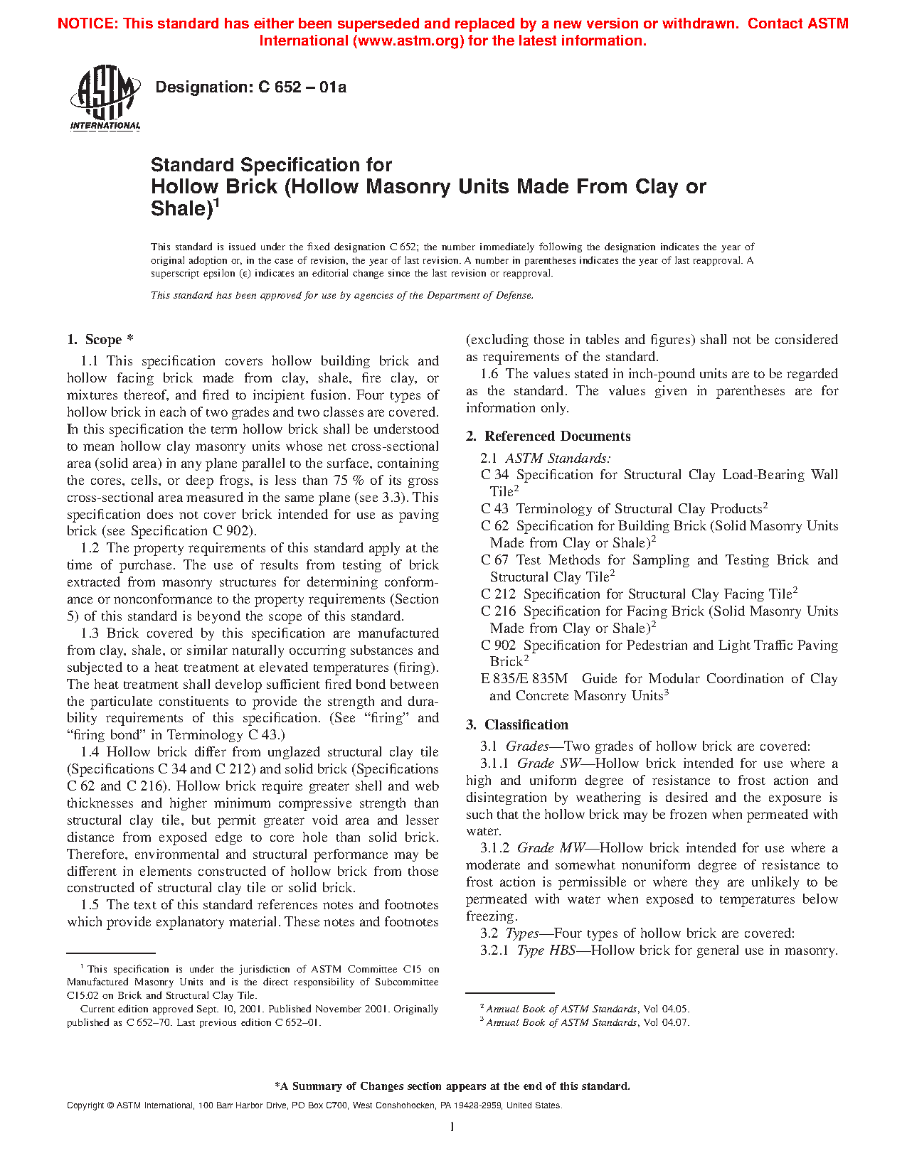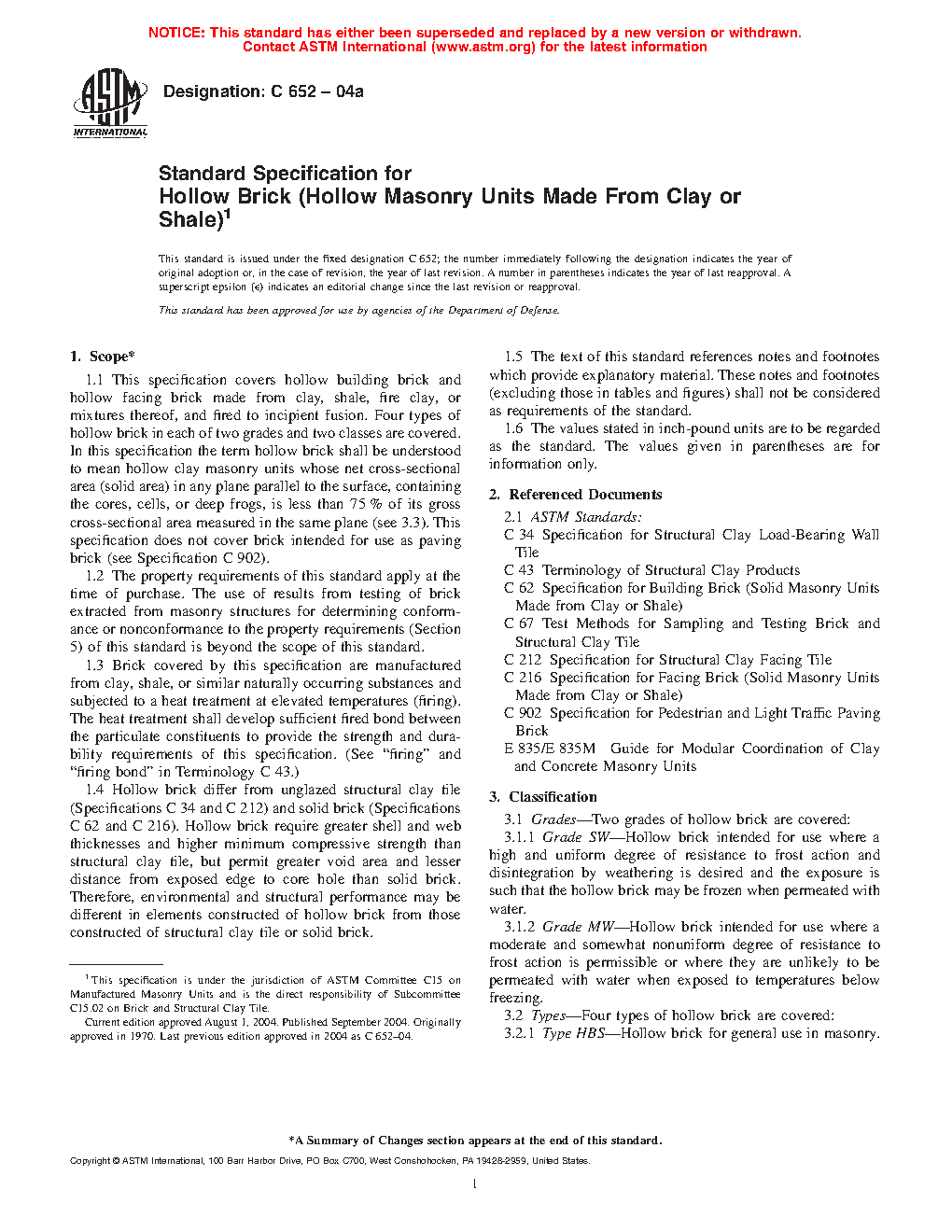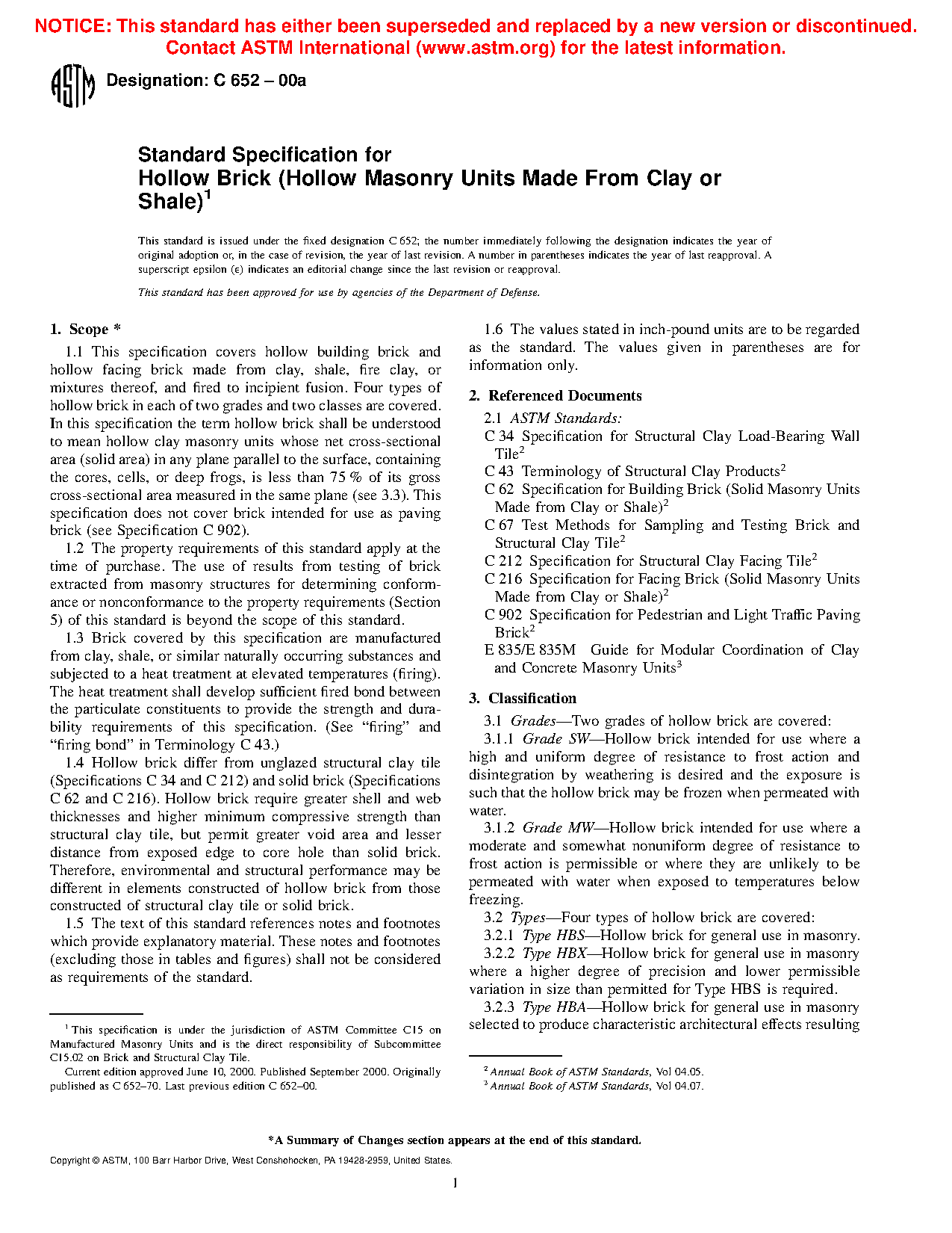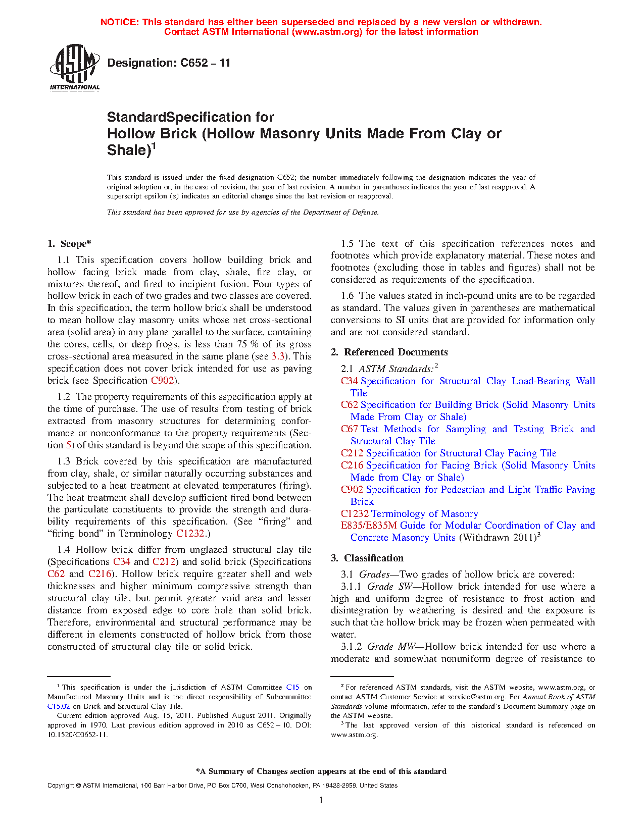 1.5 Four types of hollow brick in each of two grades and two classes are covered.