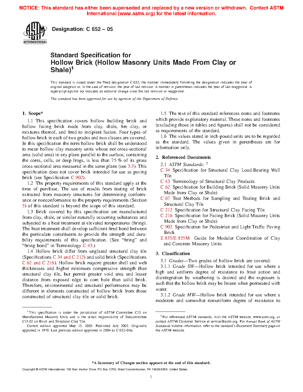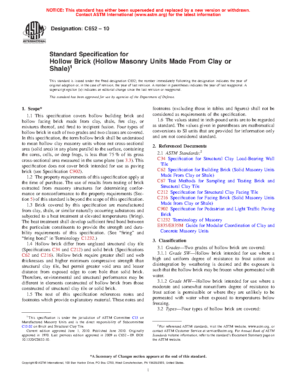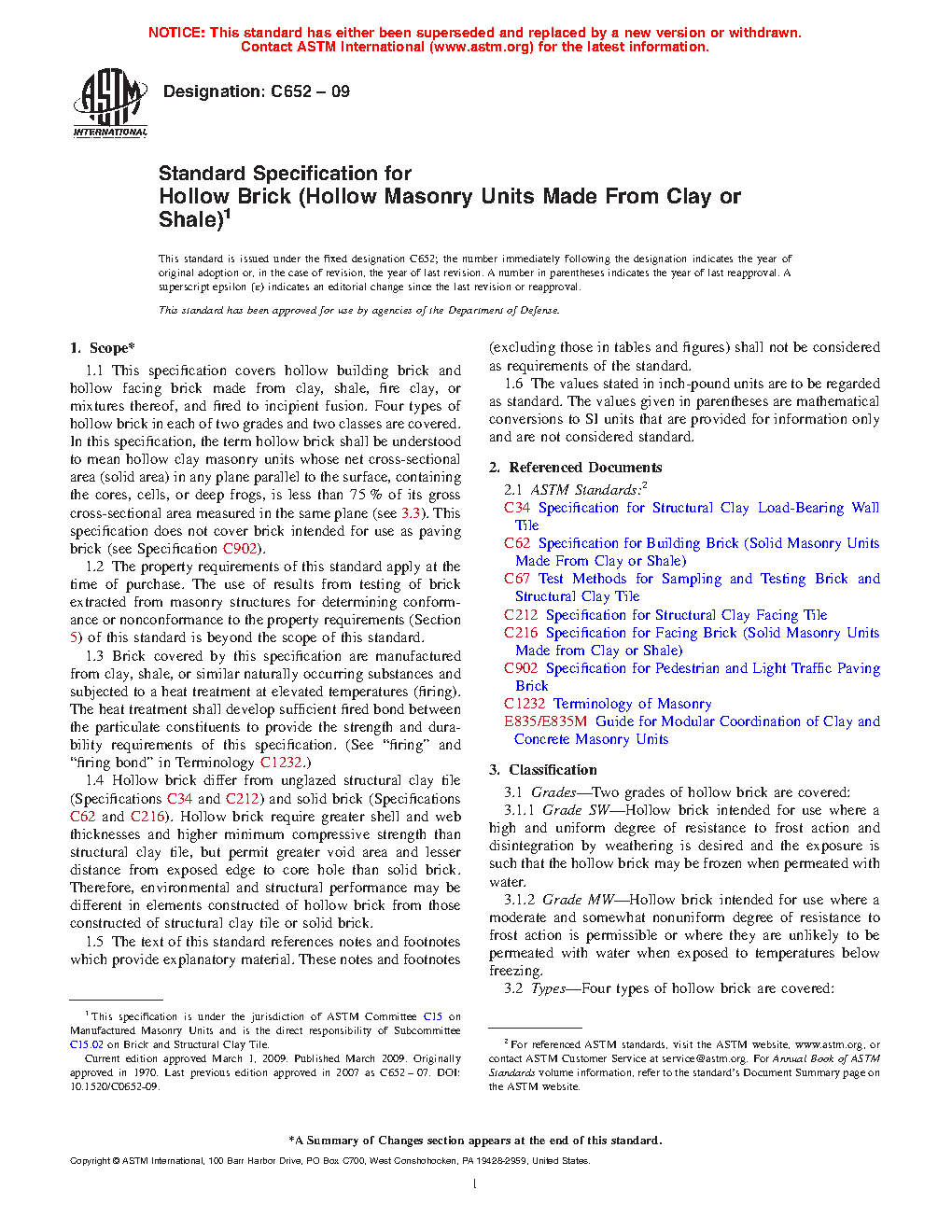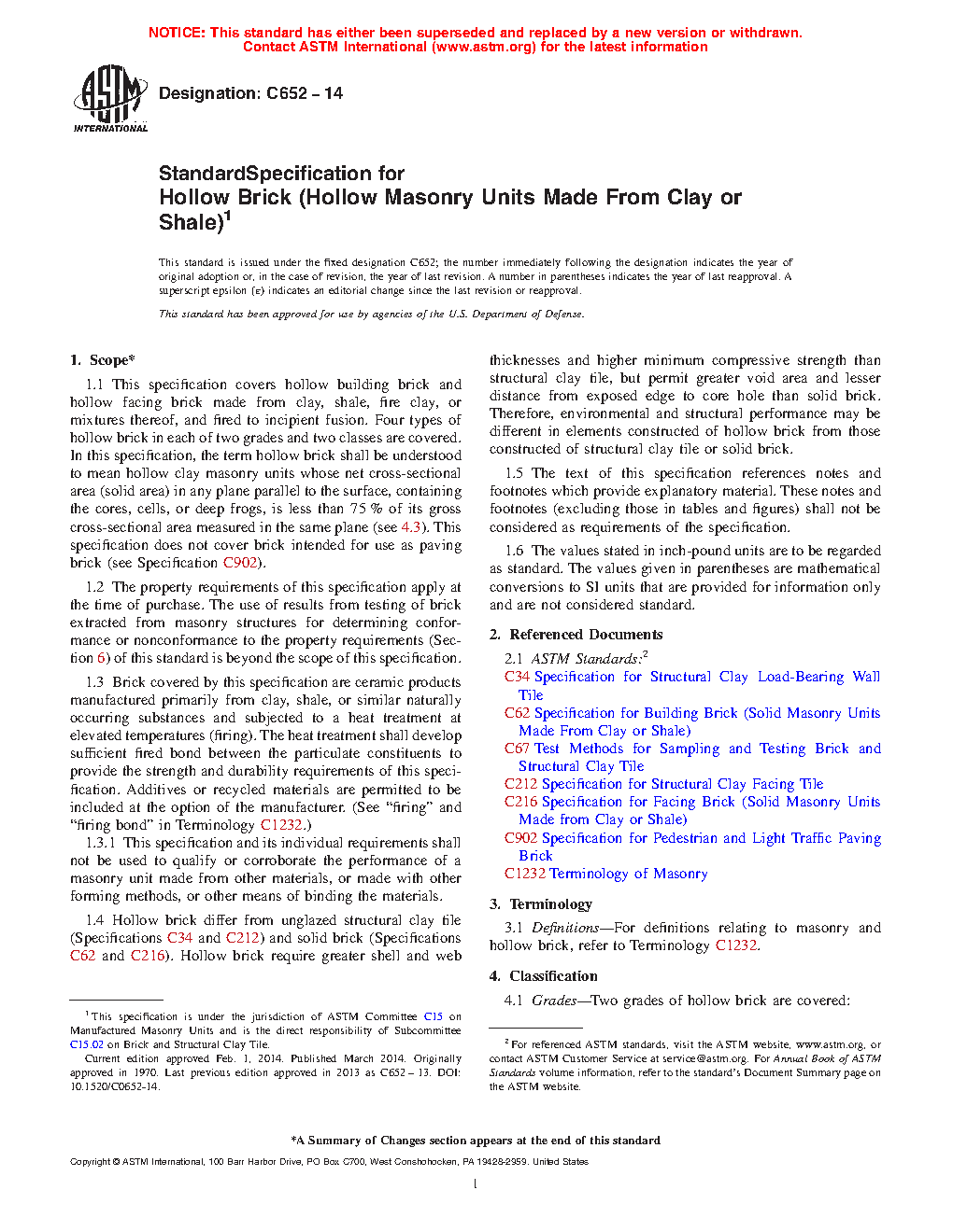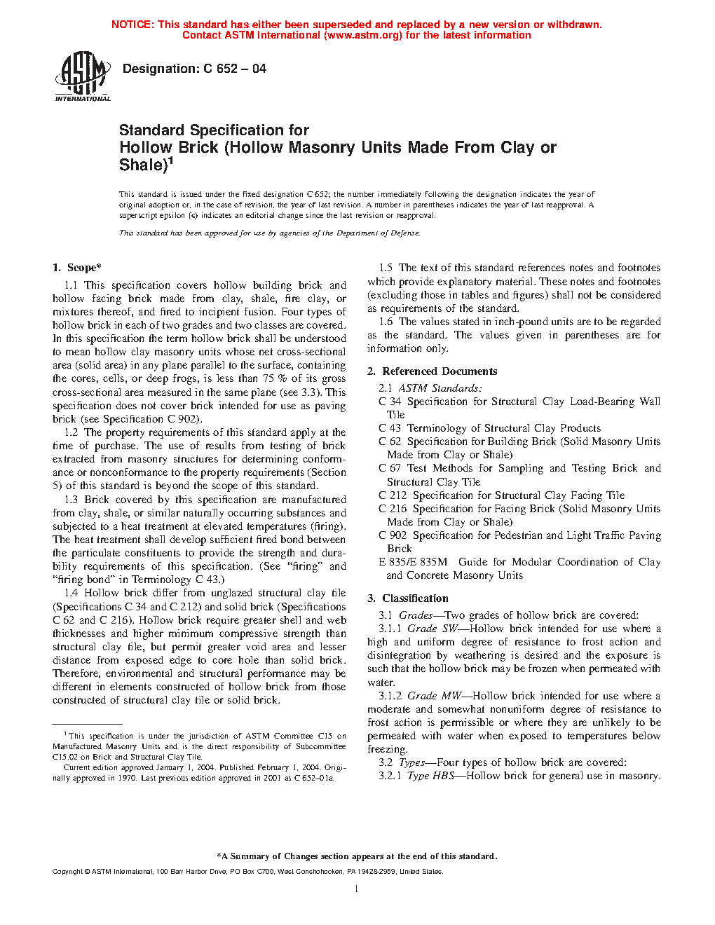 1.5 Four types of hollow brick in each of two grades and two classes are covered.