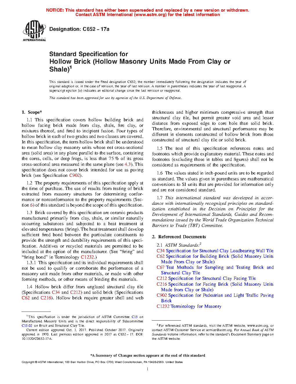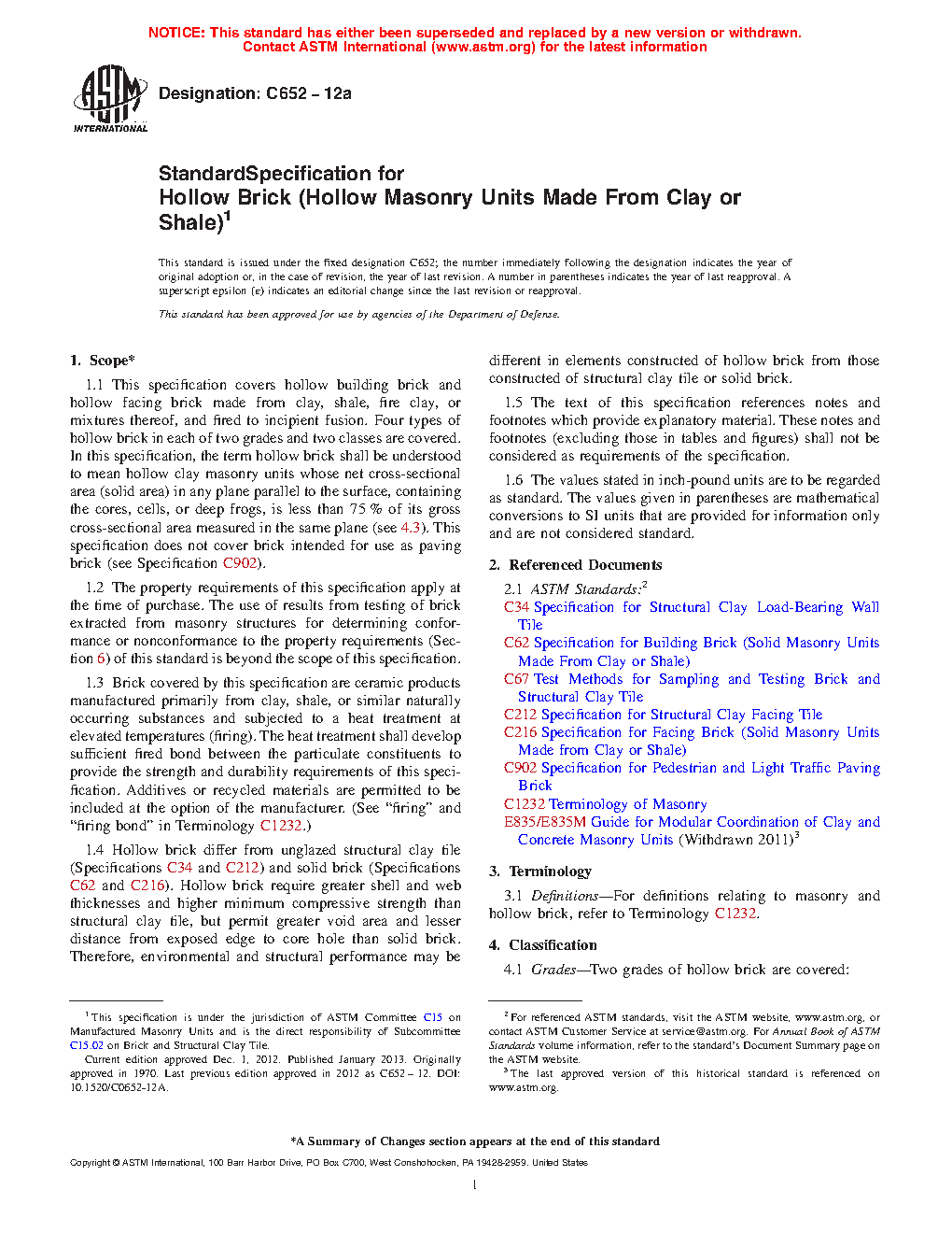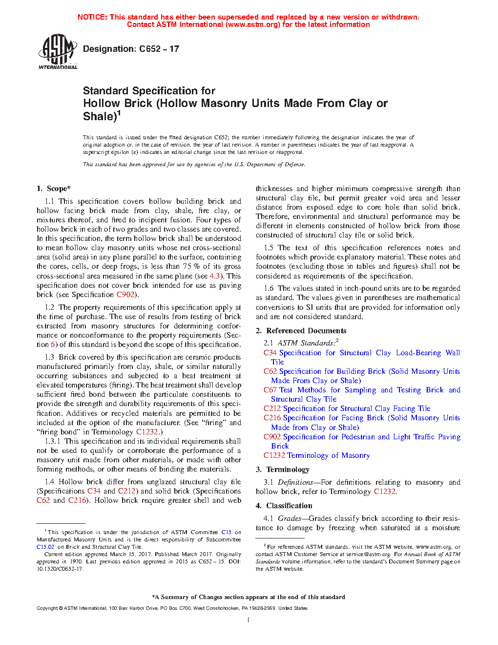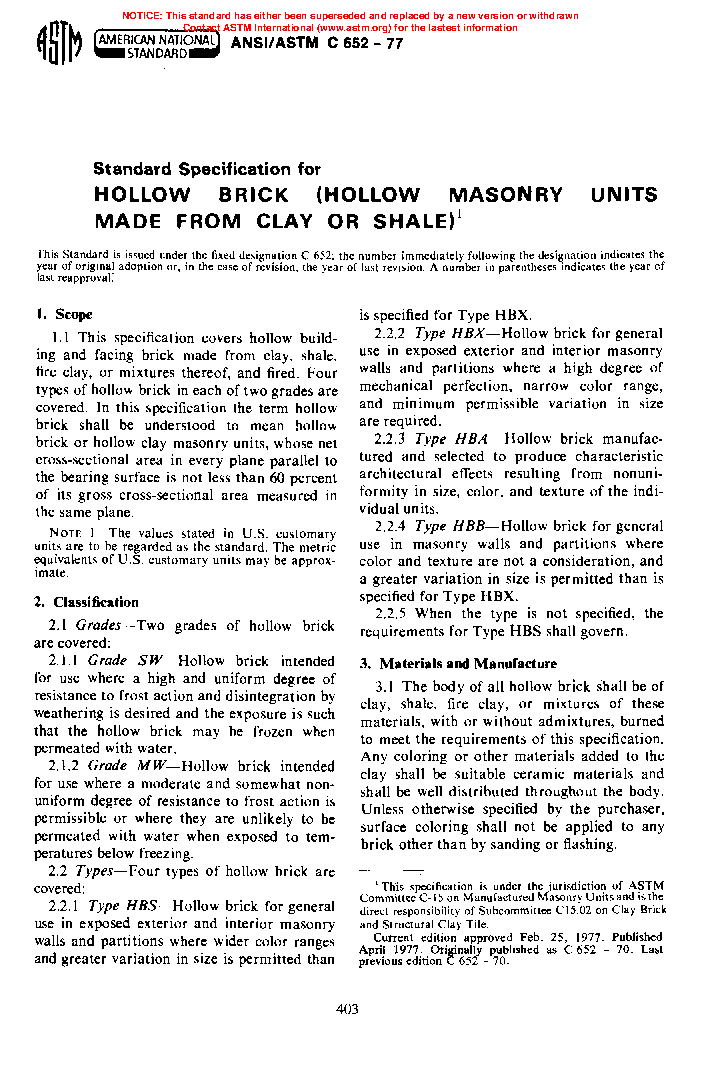 1.6 Hollow brick differ from unglazed structural clay tile (Specifications C34 and C212) and solid brick (Specifications C62 and C216). Hollow brick require greater shell and web thicknesses and higher minimum compressive strength than structural clay tile, but permit greater void area and lesser distance from exposed edge to core hole than solid brick. Therefore, environmental and structural performance may be different in elements constructed of hollow brick from those constructed of structural clay tile or solid brick.