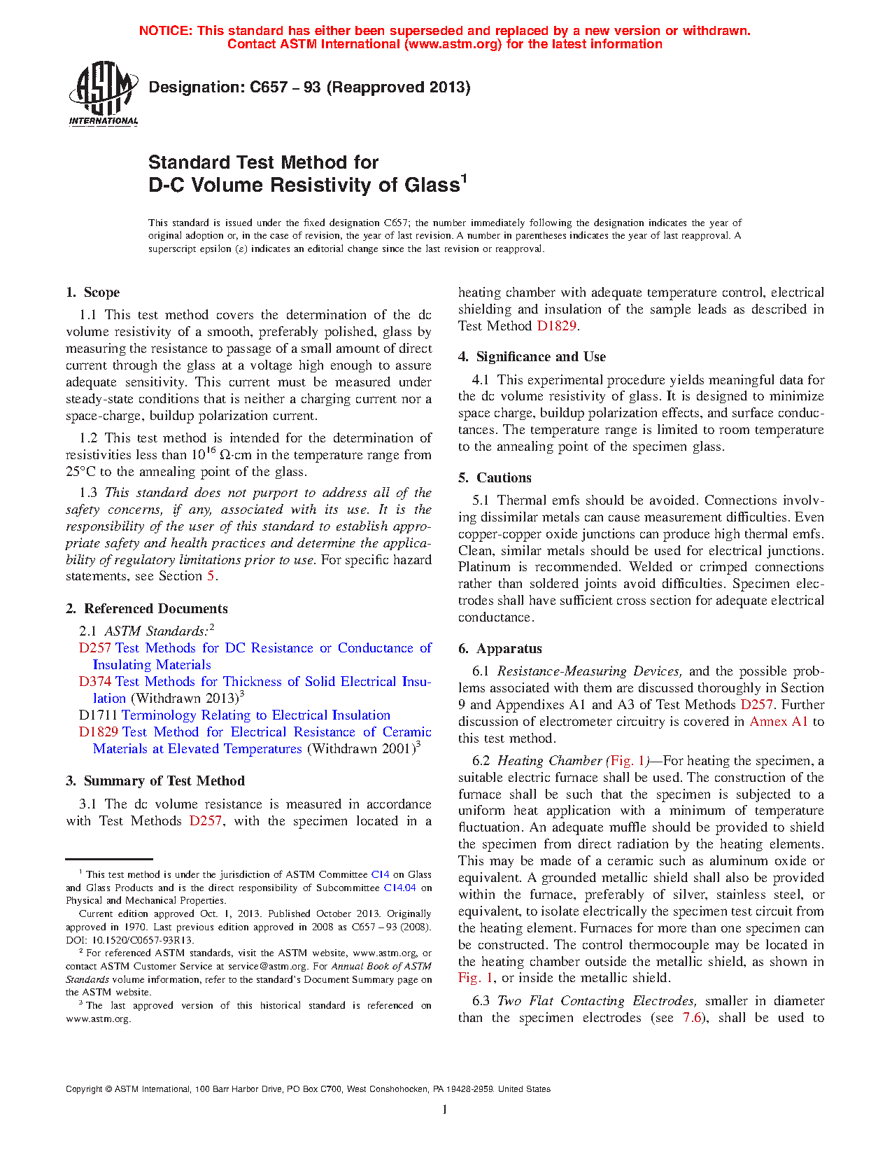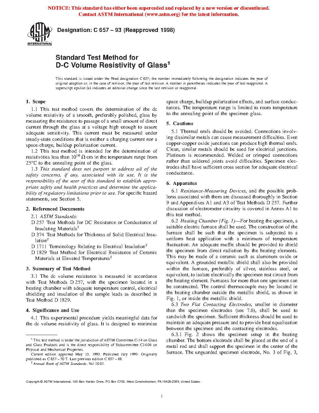 1.1 This test method covers the determination of the dc volume resistivity of a smooth, preferably polished, glass by measuring the resistance to passage of a small amount of direct current through the glass at a voltage high enough to assure adequate sensitivity. This current must be measured under steady-state conditions that is neither a charging current nor a space-charge, buildup polarization current.