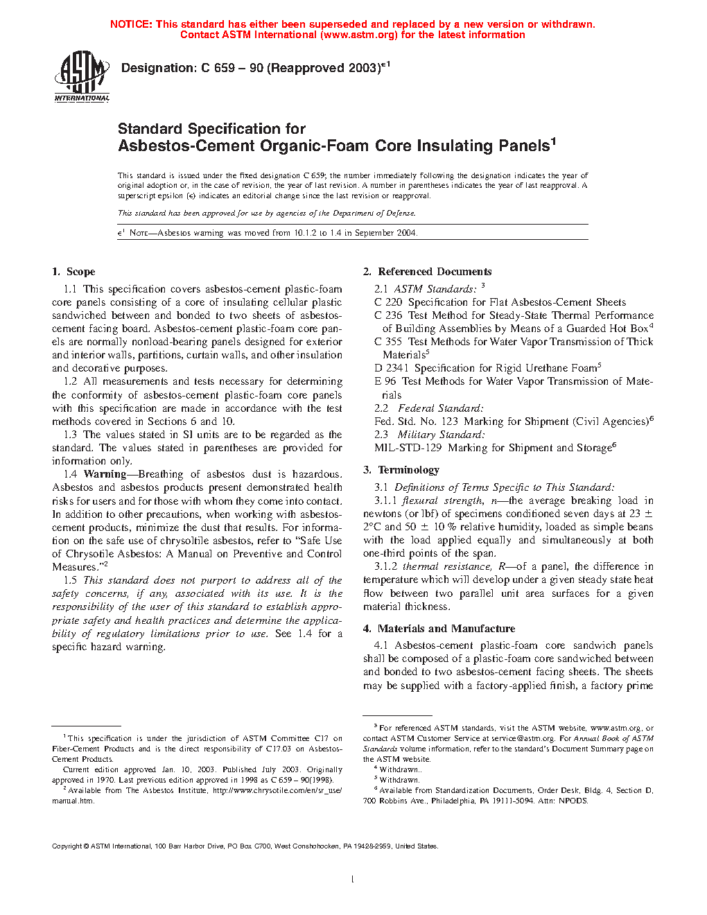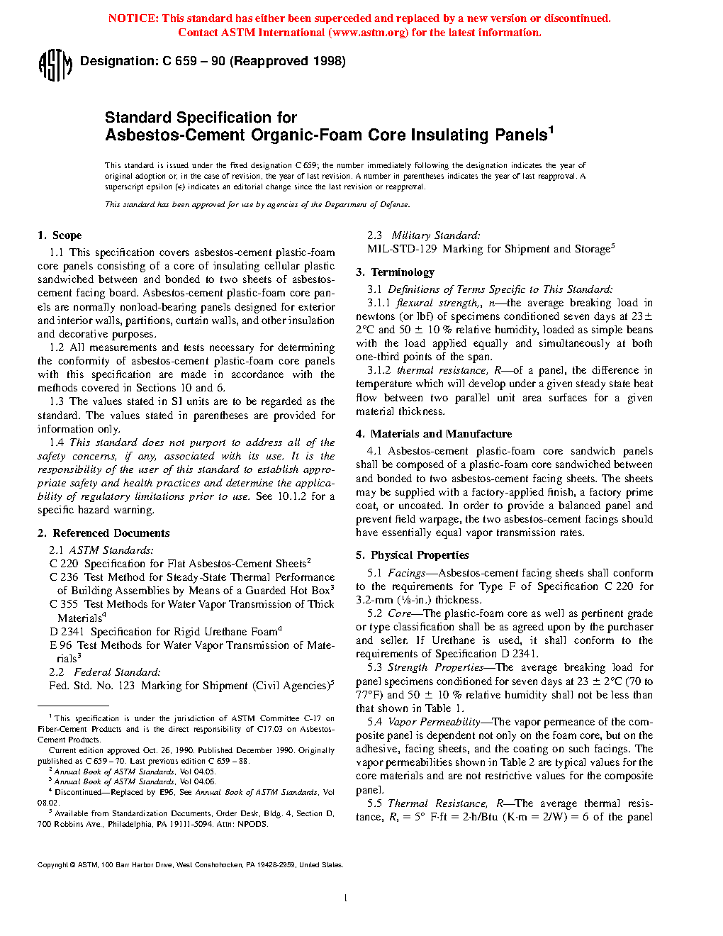 1.1 This specification covers asbestos-cement plastic-foam core panels consisting of a core of insulating cellular plastic sandwiched between and bonded to two sheets of asbestos-cement facing board. Asbestos-cement plastic-foam core panels are normally nonload-bearing panels designed for exterior and interior walls, partitions, curtain walls, and other insulation and decorative purposes.