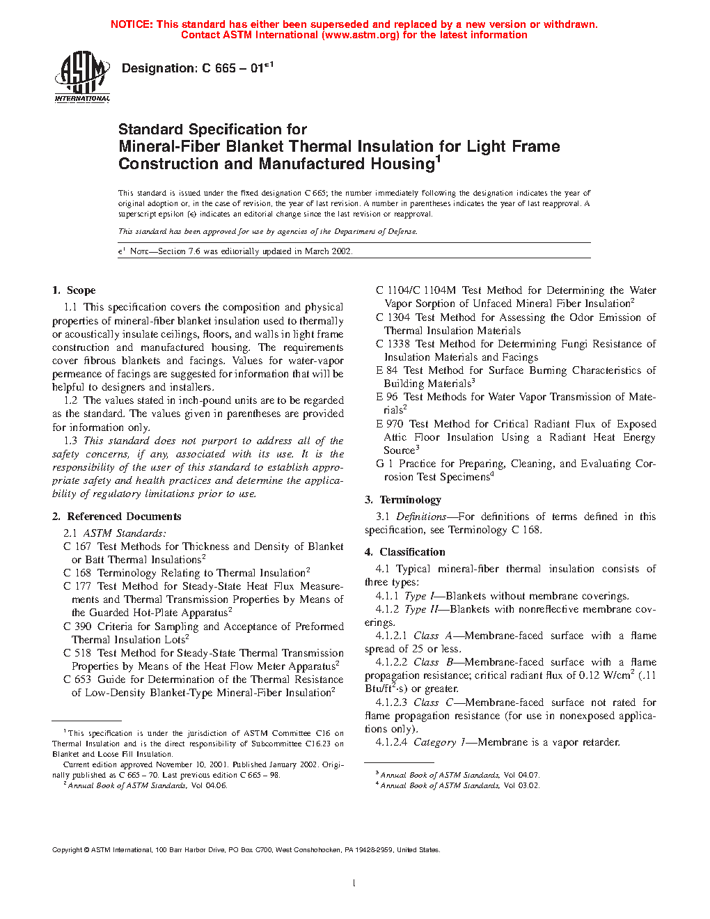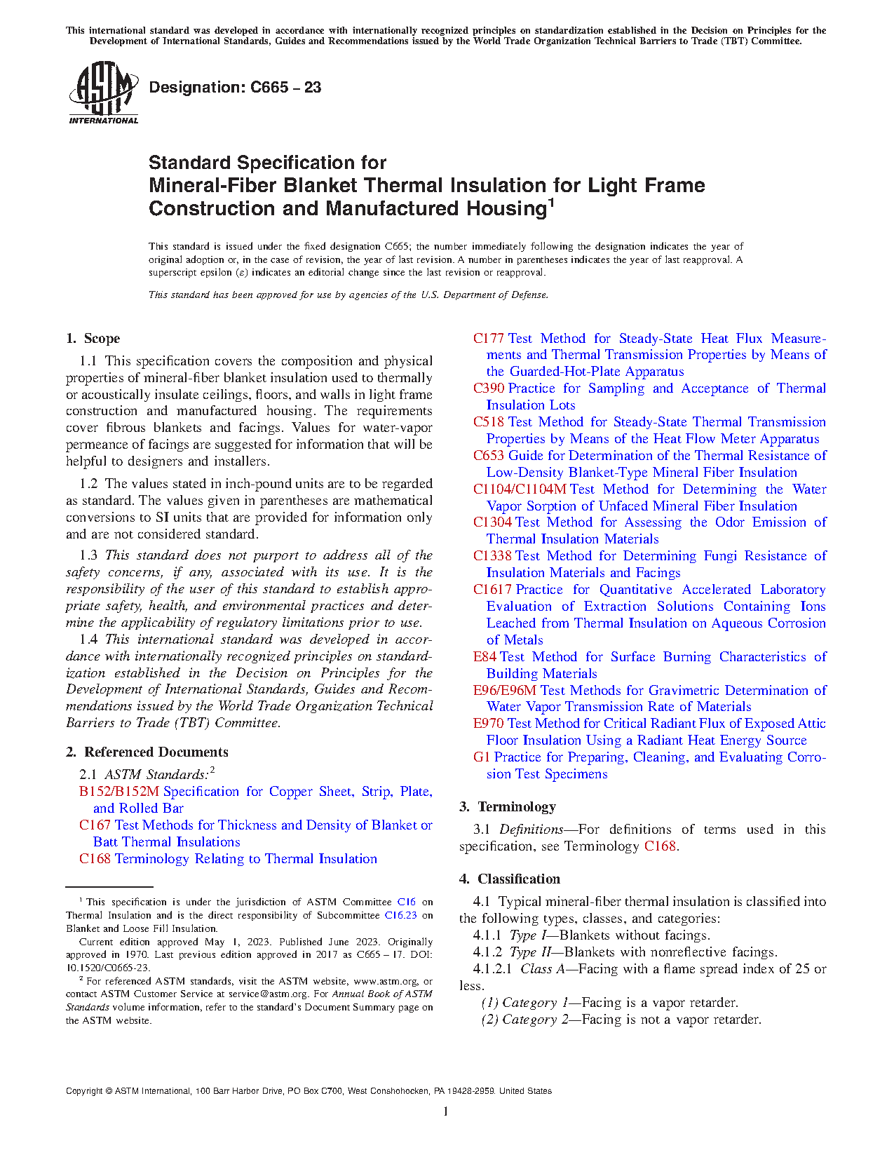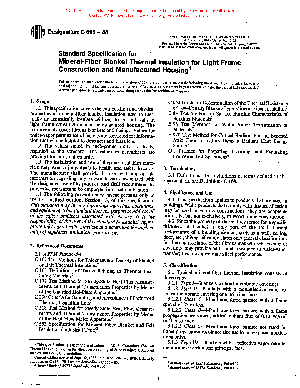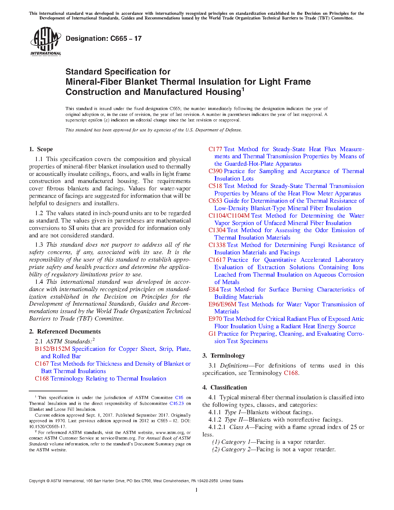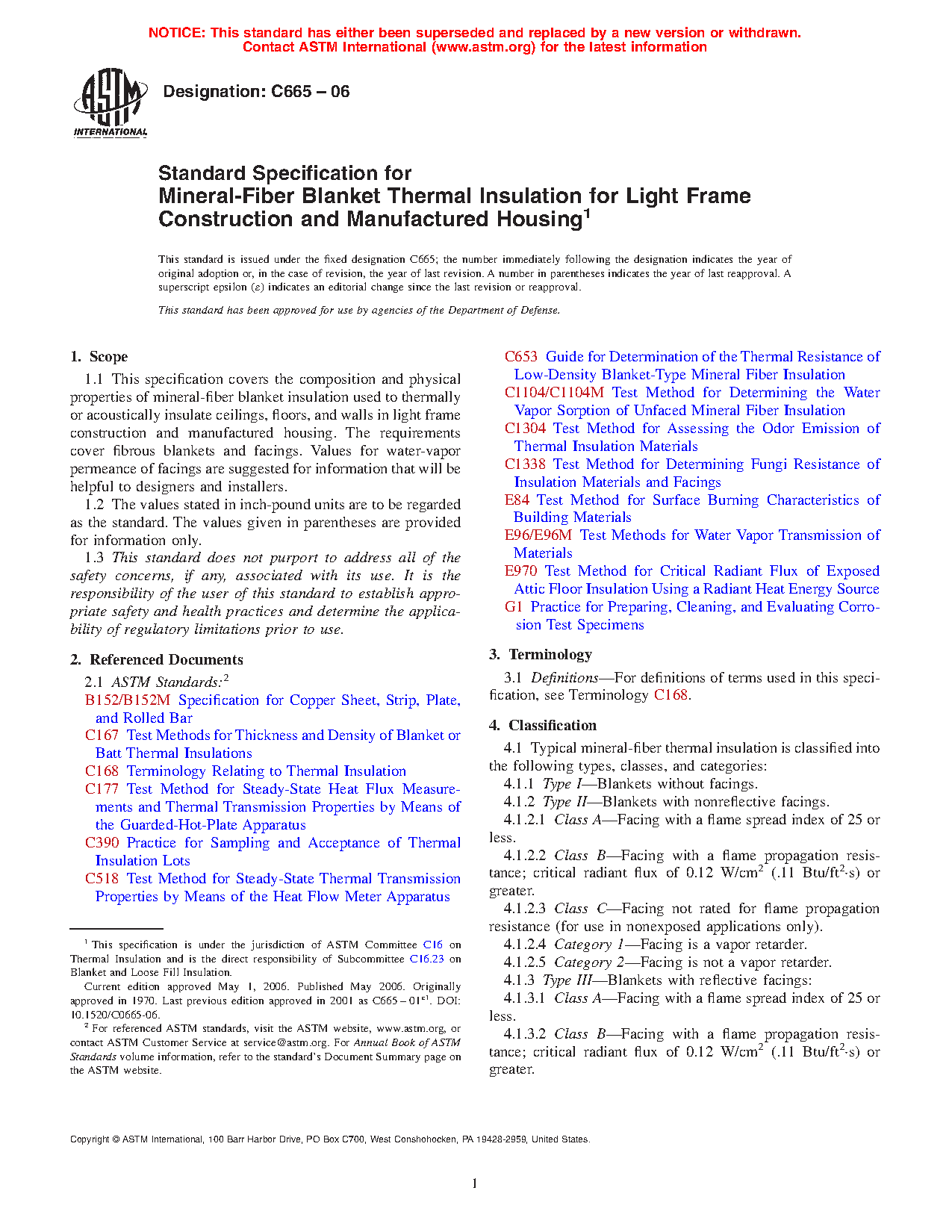 This specification covers the composition and physical properties of mineral-fiber blanket insulation used to thermally or acoustically insulate ceilings, floors, and walls in light frame construction and manufactured housing. The requirements cover fibrous blankets and facings. Typical mineral-fiber thermal insulation is classified into the following types, classes, and categories: Type I; Type II (Class A, Class B, and Class C (Category 1 and Category 2)); and Type III (Class A, Class B, and Class C (Category 1 and Category 2)). The following test methods shall be performed: dimensions; thermal resistance; surface burning characteristics; critical radiant flux; water vapor permeance; water vapor sorption; odor emission; corrosiveness; and fungi resistance.