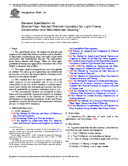 1.1 This specification covers the composition and physical properties of mineral-fiber blanket insulation used to thermally or acoustically insulate ceilings, floors, and walls in light frame construction and manufactured housing. The requirements cover fibrous blankets and facings. Values for water-vapor permeance of facings are suggested for information that will be helpful to designers and installers.