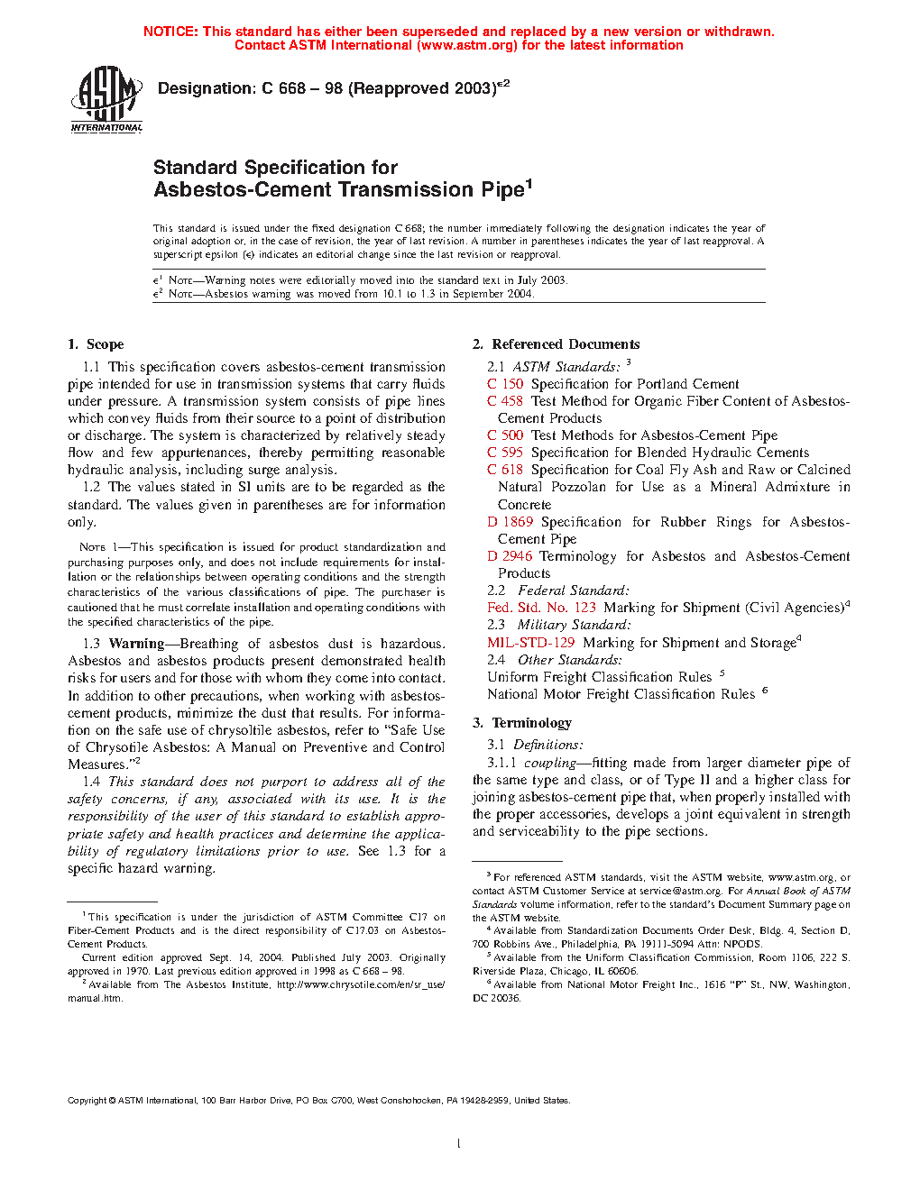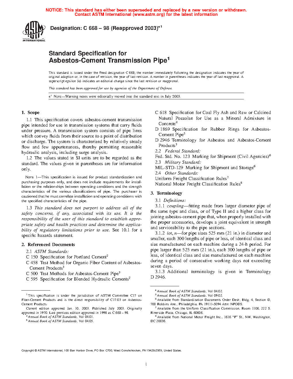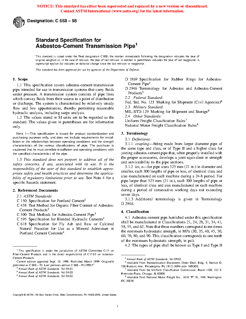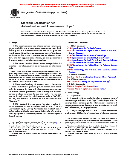 This specification covers asbestos-cement transmission pipes intended for use in transmission systems that carry fluids under pressure. The pipes furnished under this specification shall be manufactured in Classifications 21, 24, 28, 31, 34, 41, 58, 55, and 62, which correspond to ten times the minimum hydrostatic strength in MPa (or one tenth of the minimum hydrostatic strength in psi). The types of pipe shall be known as Type I and Type II corresponding to the uncombined calcium hydroxide content. Besides the hydrostatic strength, pipes shall also be tested and conform accordingly to specified requirements for flexural strength, crushing strength, and dimensions.