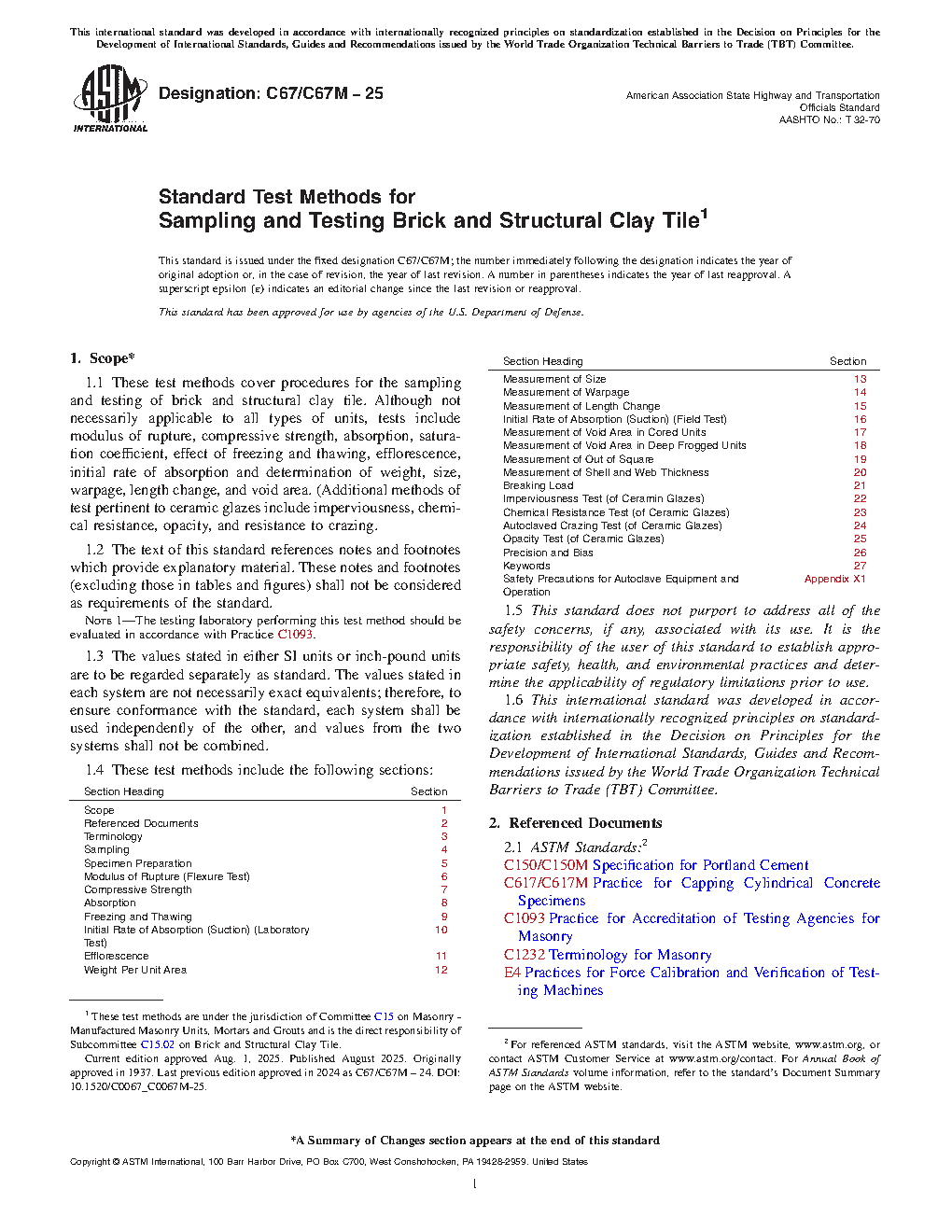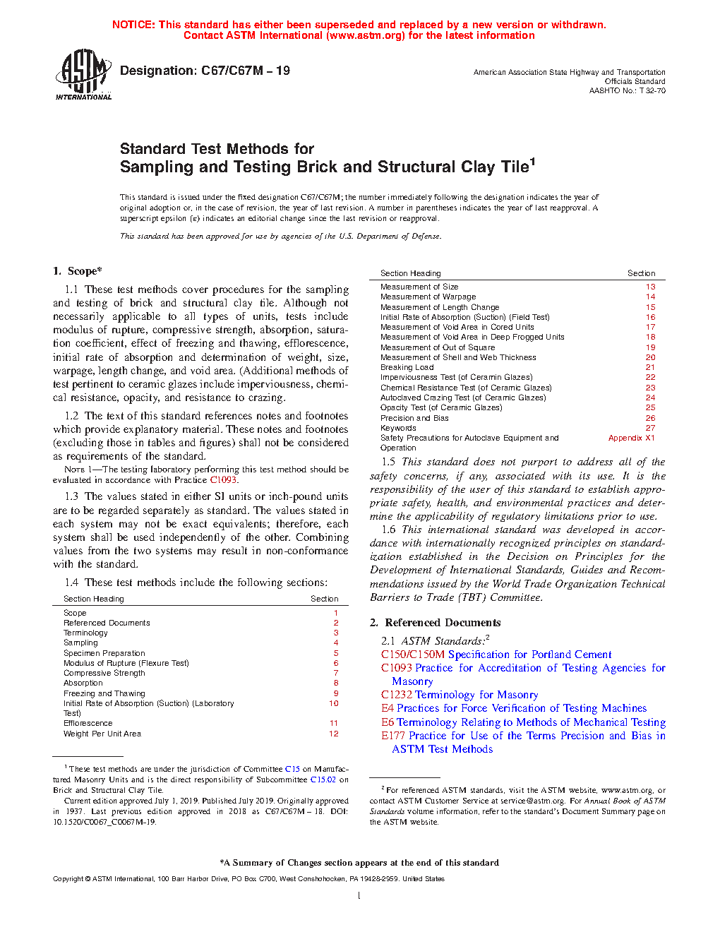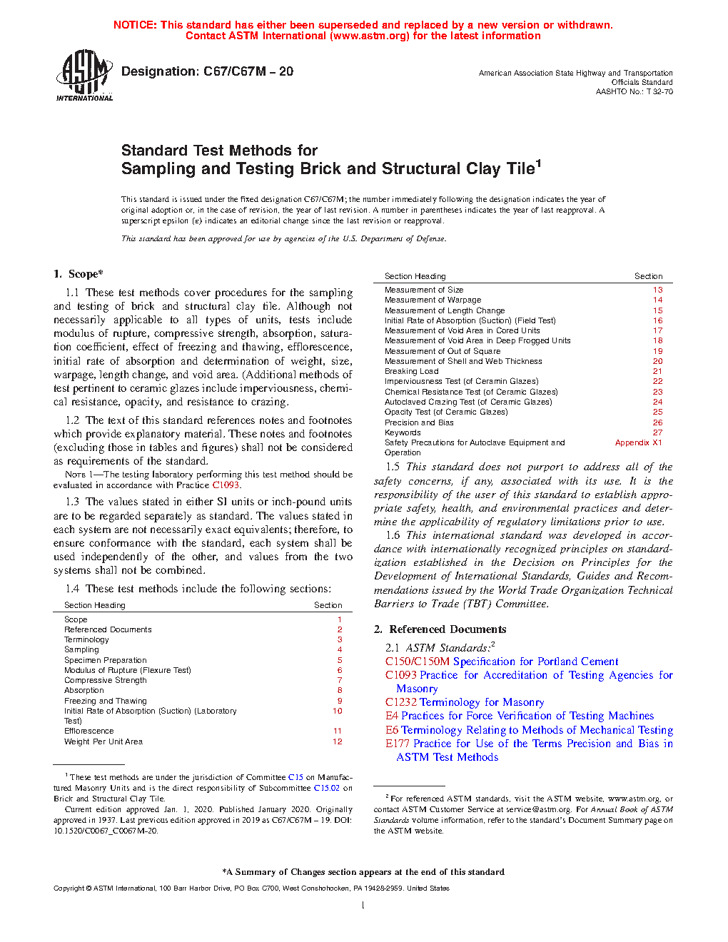 1.1 These test methods cover procedures for the sampling and testing of brick and structural clay tile. Although not necessarily applicable to all types of units, tests include modulus of rupture, compressive strength, absorption, saturation coefficient, effect of freezing and thawing, efflorescence, initial rate of absorption and determination of weight, size, warpage, length change, and void area. (Additional methods of test pertinent to ceramic glazes include imperviousness, chemical resistance, opacity, and resistance to crazing.