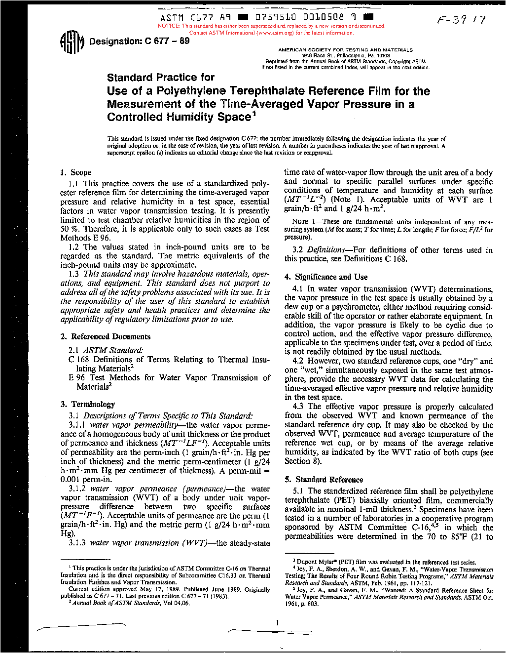 Practice for Use of a Polyethylene Terephthalate Reference Film for the Measurement of the Time-Averaged Vapor Pressure in a Controlled Humidity Space (Withdrawn 1990)