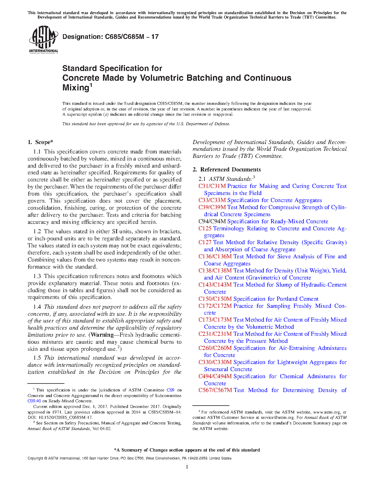 1.1 This specification covers concrete made from materials continuously batched by volume, mixed in a continuous mixer, and delivered to the purchaser in a freshly mixed and unhardened state as hereinafter specified. Requirements for quality of concrete shall be either as hereinafter specified or as specified by the purchaser. When the requirements of the purchaser differ from this specification, the purchaser's specification shall govern. This specification does not cover the placement, consolidation, finishing, curing, or protection of the concrete after delivery to the purchaser. Tests and criteria for batching accuracy and mixing efficiency are specified herein.
