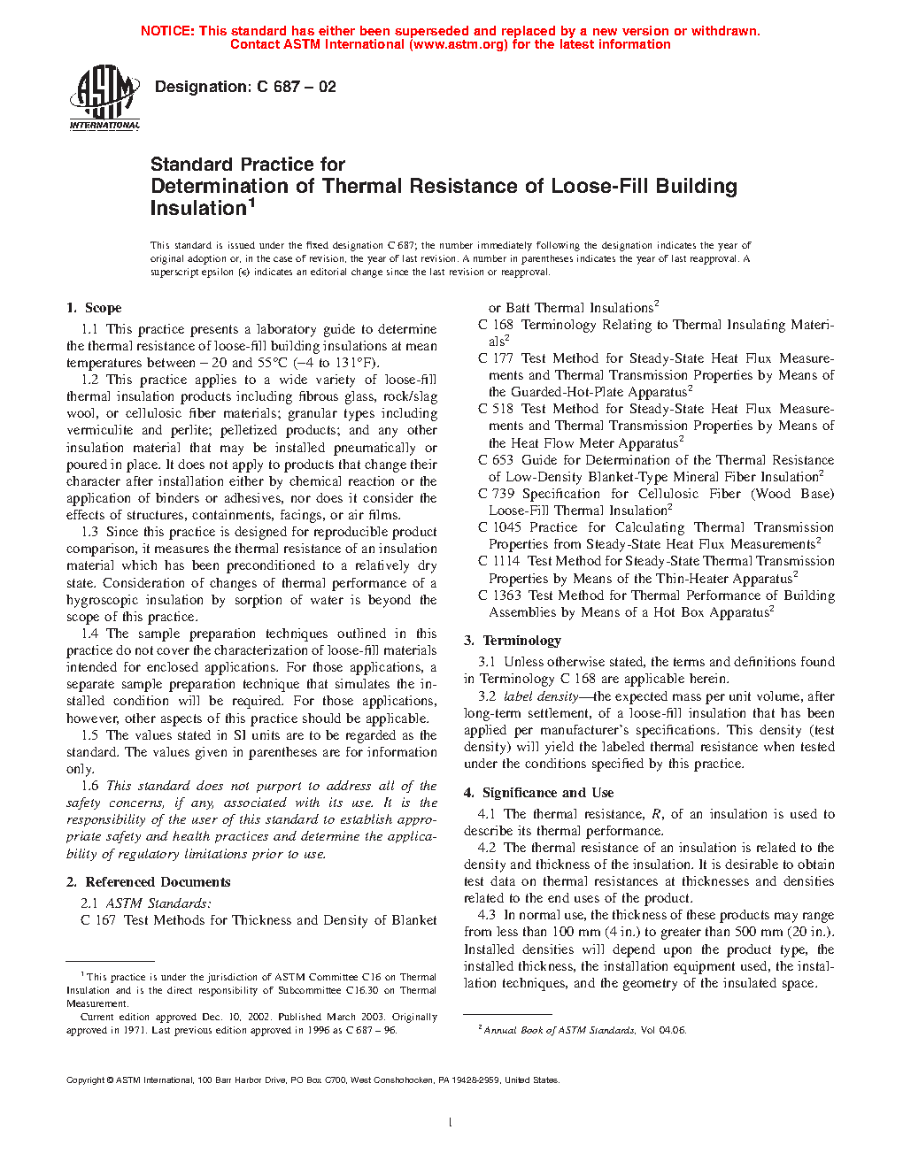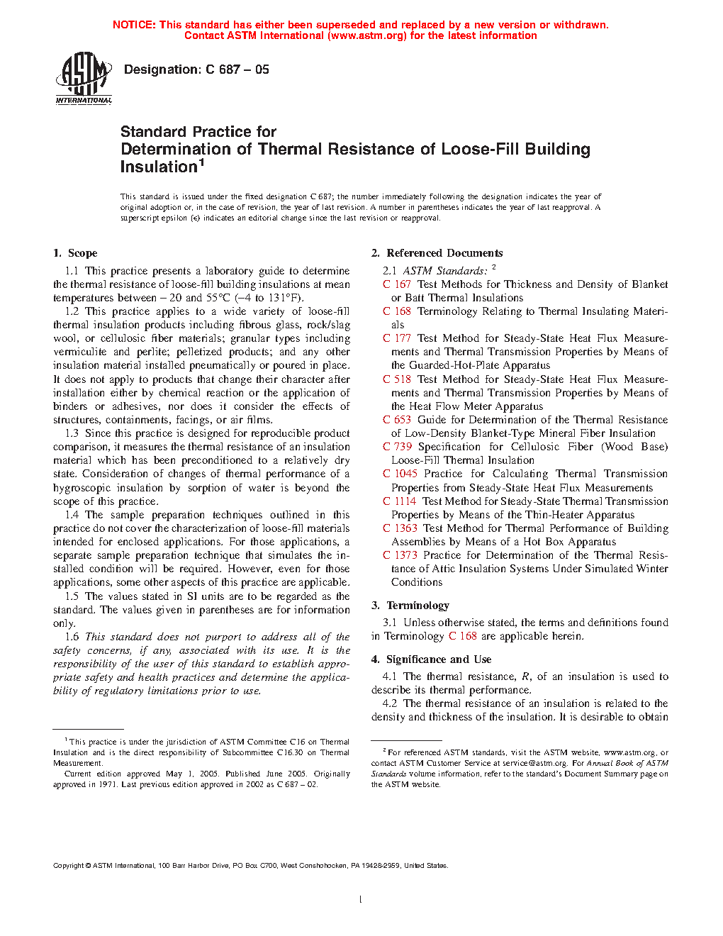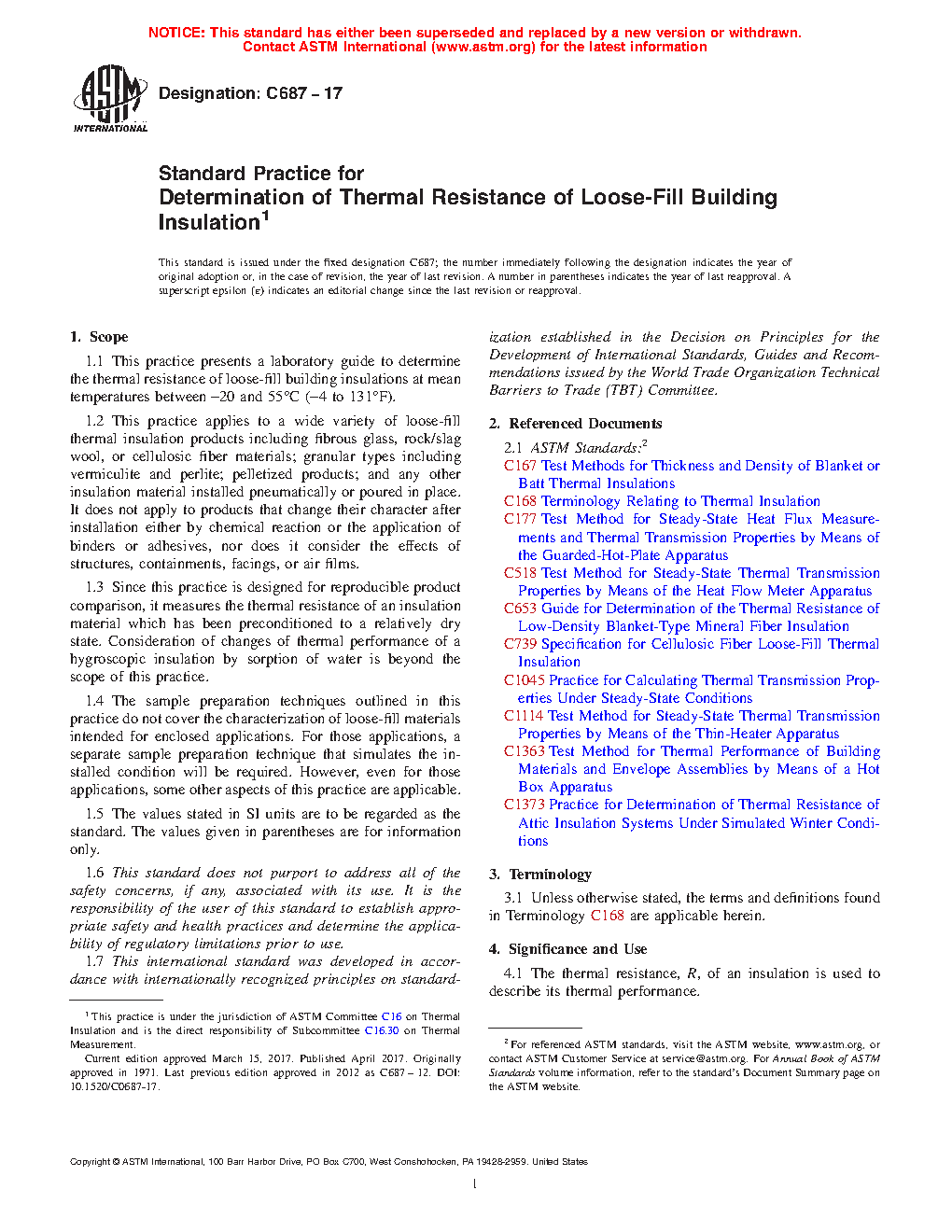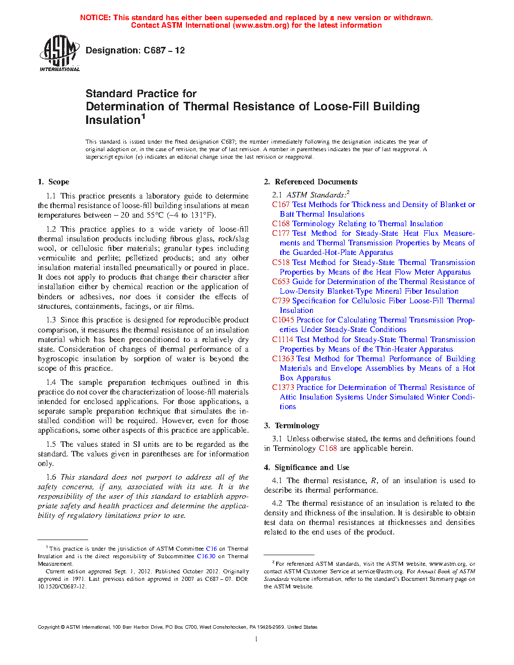 4.12 Loosefill insulation installed in attic applications will have heat flow up during the winter. At winter design conditions in many areas, the winter design temperature difference will cause convective heat transfer to occur within some loose-fill insulations. The procedure outlined in Practice C687 is not applicable to that measurement unless a Test Method C1363 test apparatus is used to reproduce the correct boundary conditions. To determine how seasonal differences can affect product performance, use Practice C1373. Practice C1373 measures the expected winter thermal performance of loose-fill insulation under simulated winter design temperature conditions and provides specimen requirements necessary for that determination.