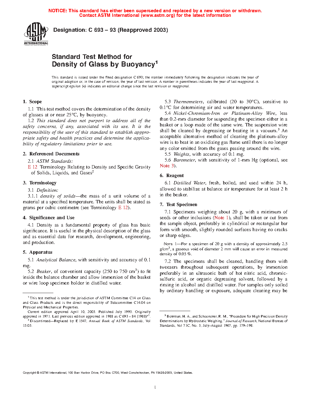 1.1 This test method covers the determination of the density of glasses at or near 25 °C, by buoyancy.