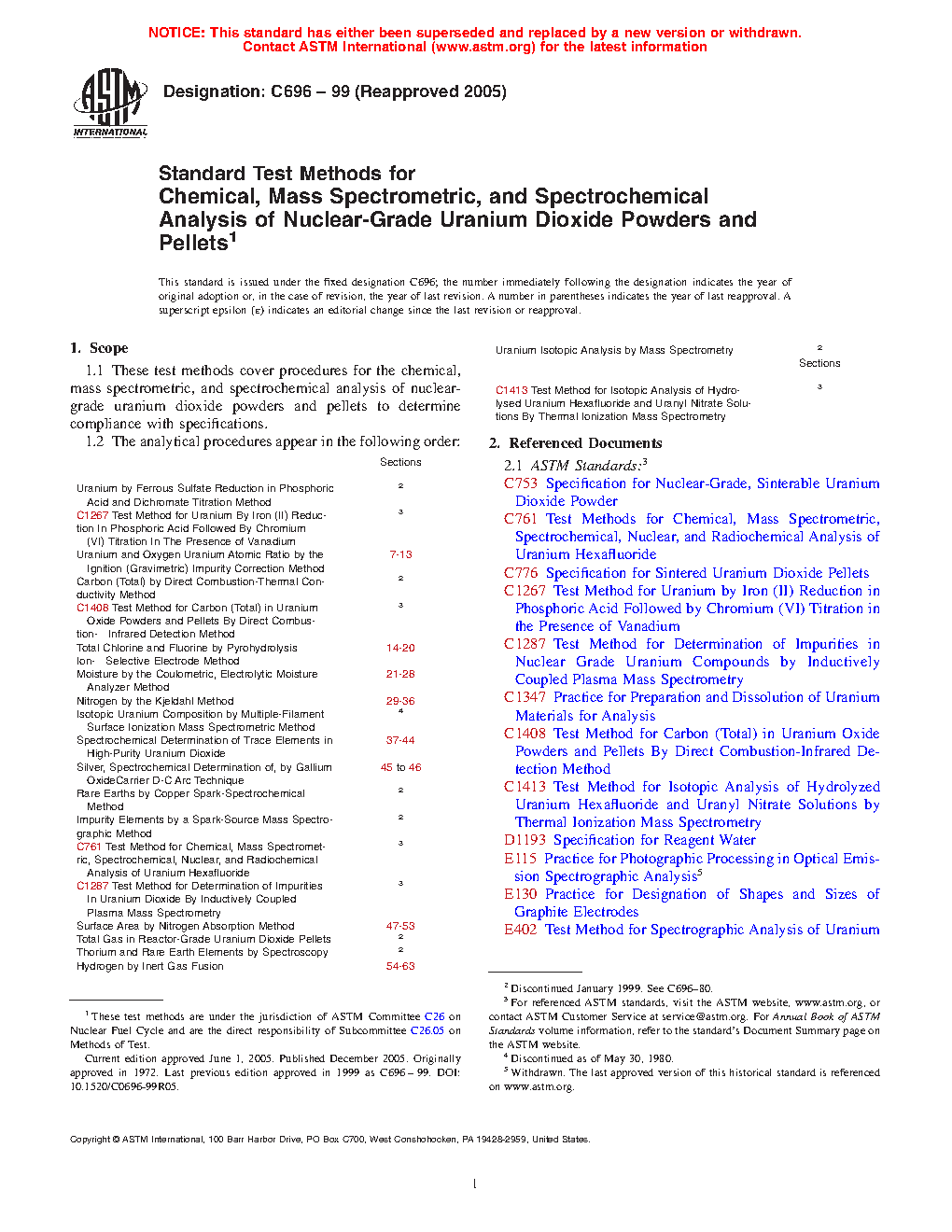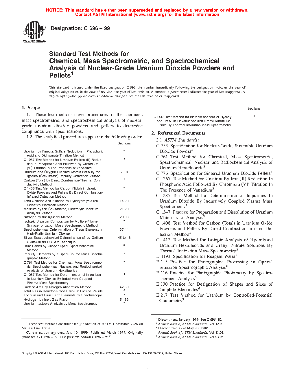 1.1 These test methods cover procedures for the chemical, mass spectrometric, and spectrochemical analysis of nuclear-grade uranium dioxide powders and pellets to determine compliance with specifications.