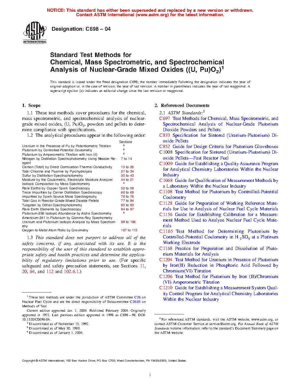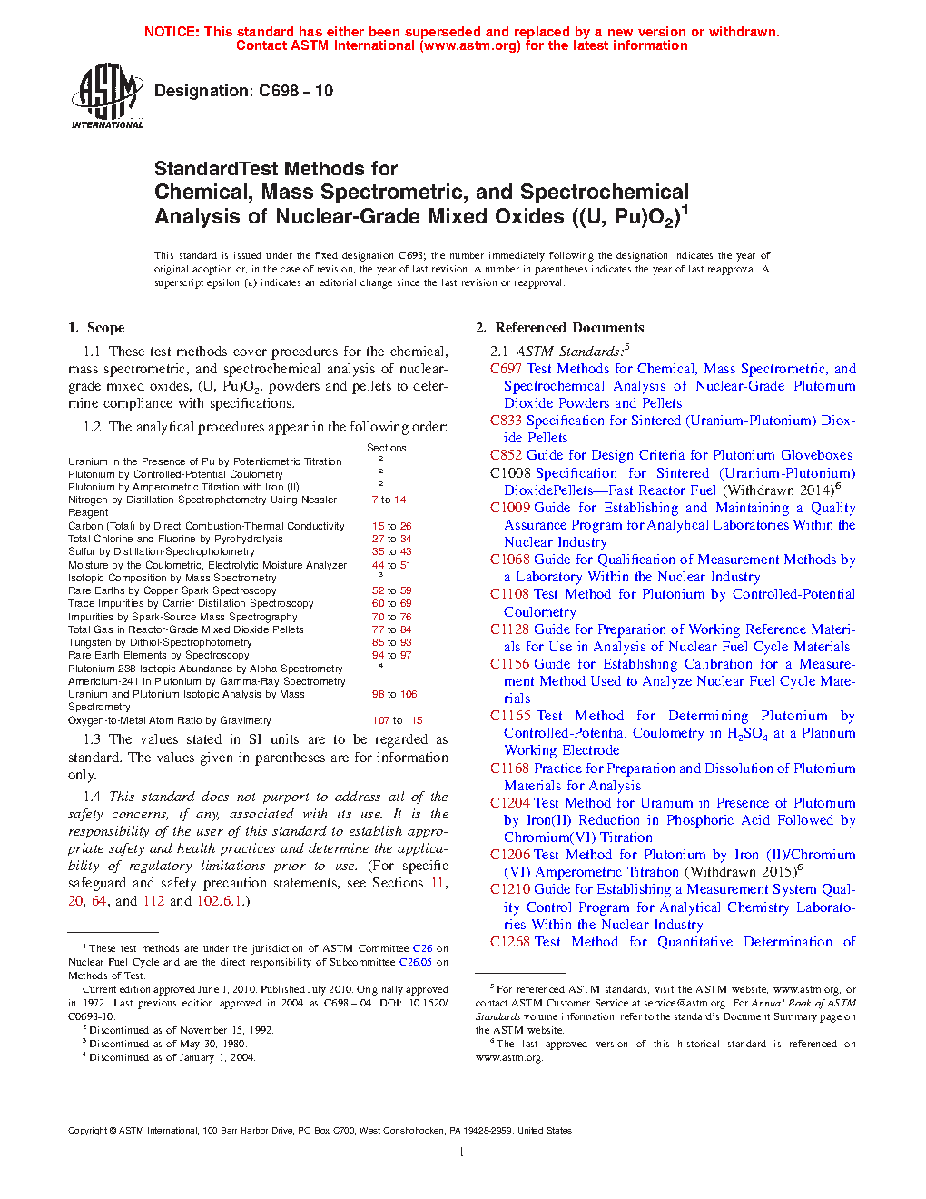 1.1 These test methods cover procedures for the chemical, mass spectrometric, and spectrochemical analysis of nuclear-grade mixed oxides, (U, Pu)O2, powders and pellets to determine compliance with specifications.