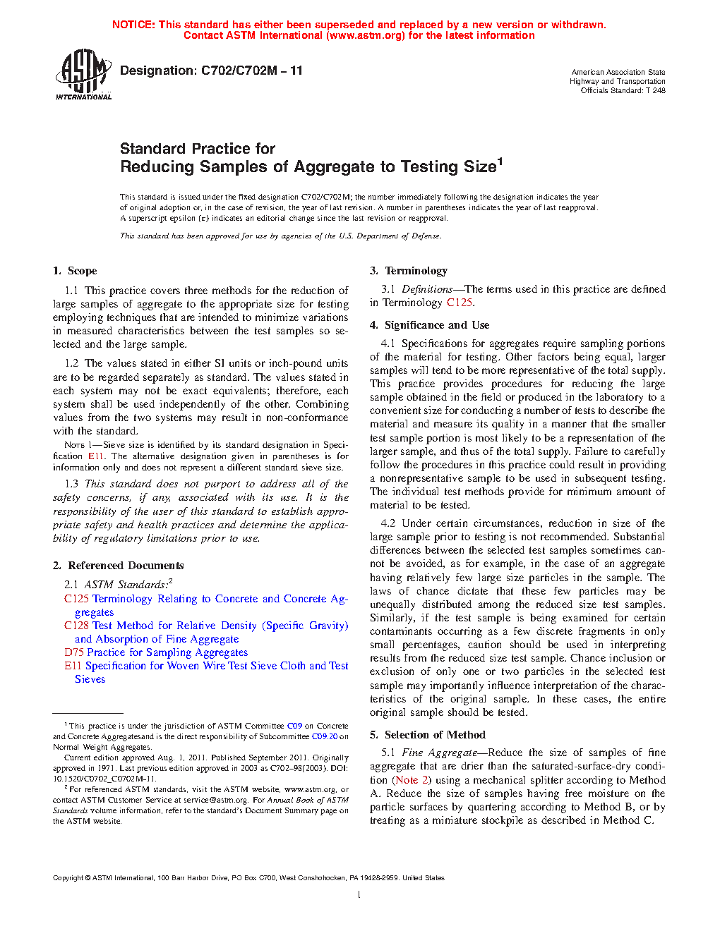4.1 Specifications for aggregates require obtaining representative portions of the supply material for testing. Other factors being equal, larger samples will tend to be more representative of the total supply. This practice provides procedures for reducing the large sample obtained in the field, or produced in the laboratory, to a convenient size for conducting a number of descriptive and quality tests. Failure to carefully follow the procedures in this practice could result in providing a non-representative sample to be used in subsequent testing. The individual test methods provide for minimum amount of material to be tested.