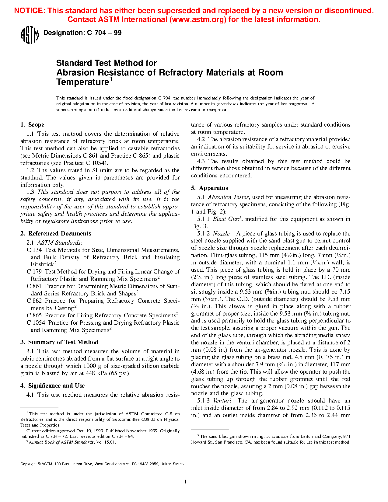 1.1 This test method covers the determination of relative abrasion resistance of refractory brick at room temperature. This test method can also be applied to castable refractories (see Metric Dimensions C861 and Practice C865) and plastic refractories (see Practice C1054).