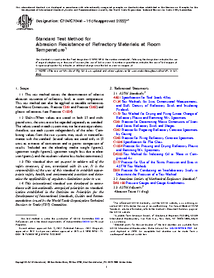 1.1 This test method covers the determination of relative abrasion resistance of refractory brick at room temperature. This test method can also be applied to castable refractories (see Metric Dimensions, Practice C 861