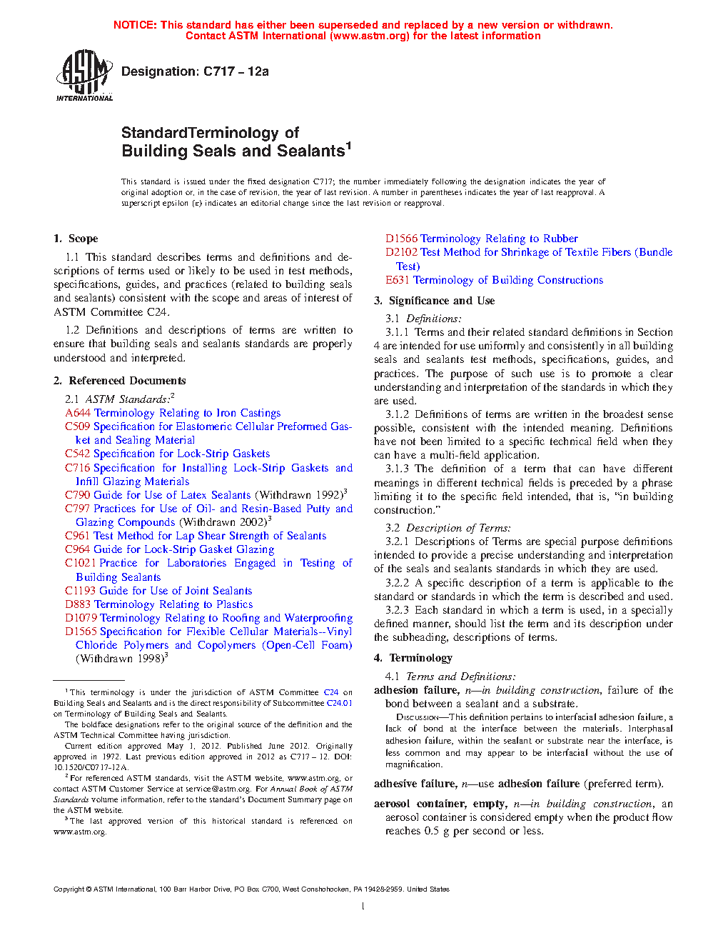 1.1 This standard covers terms, related standard definitions, and descriptions of terms used or likely to be used in standard test methods, specifications, guides, and practices (related to building seals and sealants) consistent with the scope and areas of interest of ASTM Committee C24.