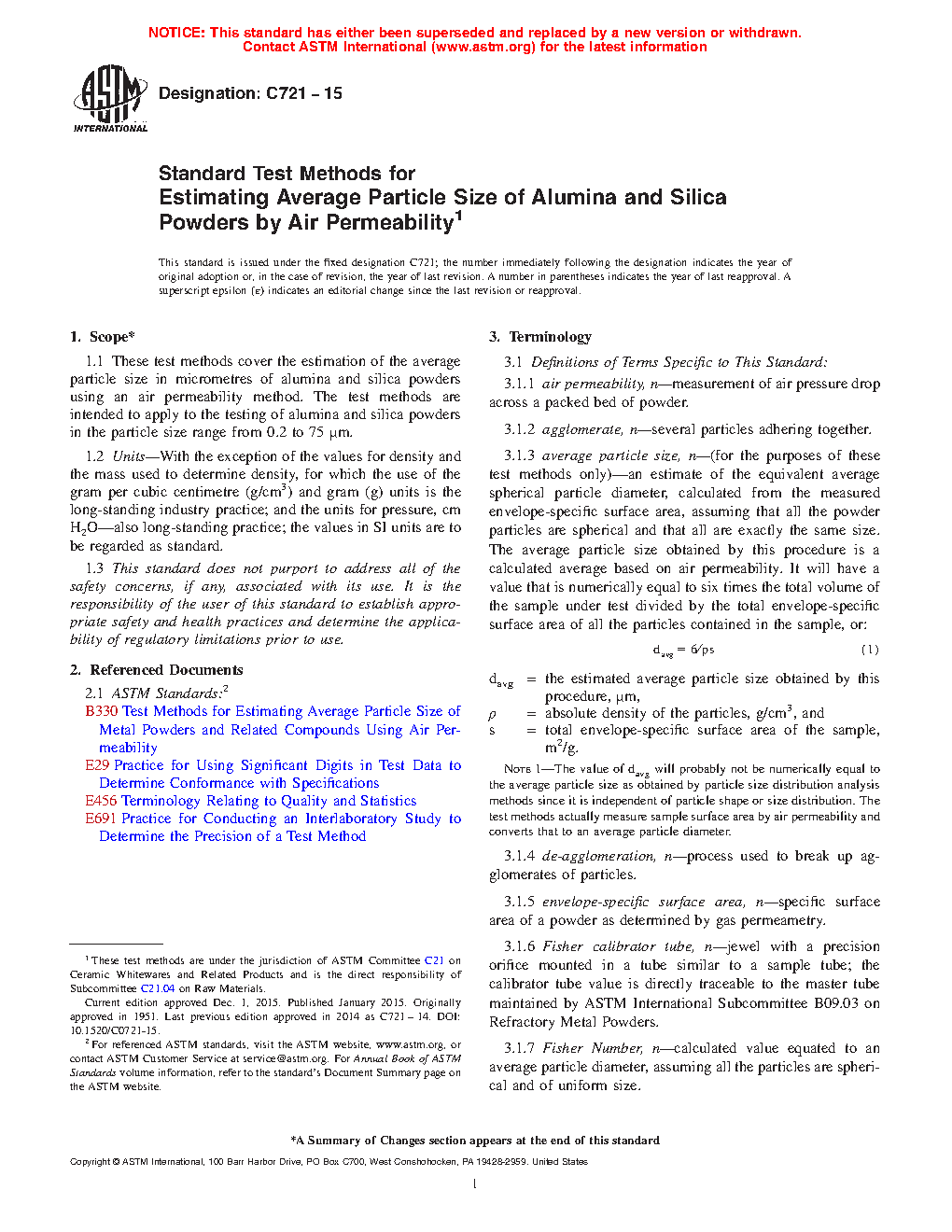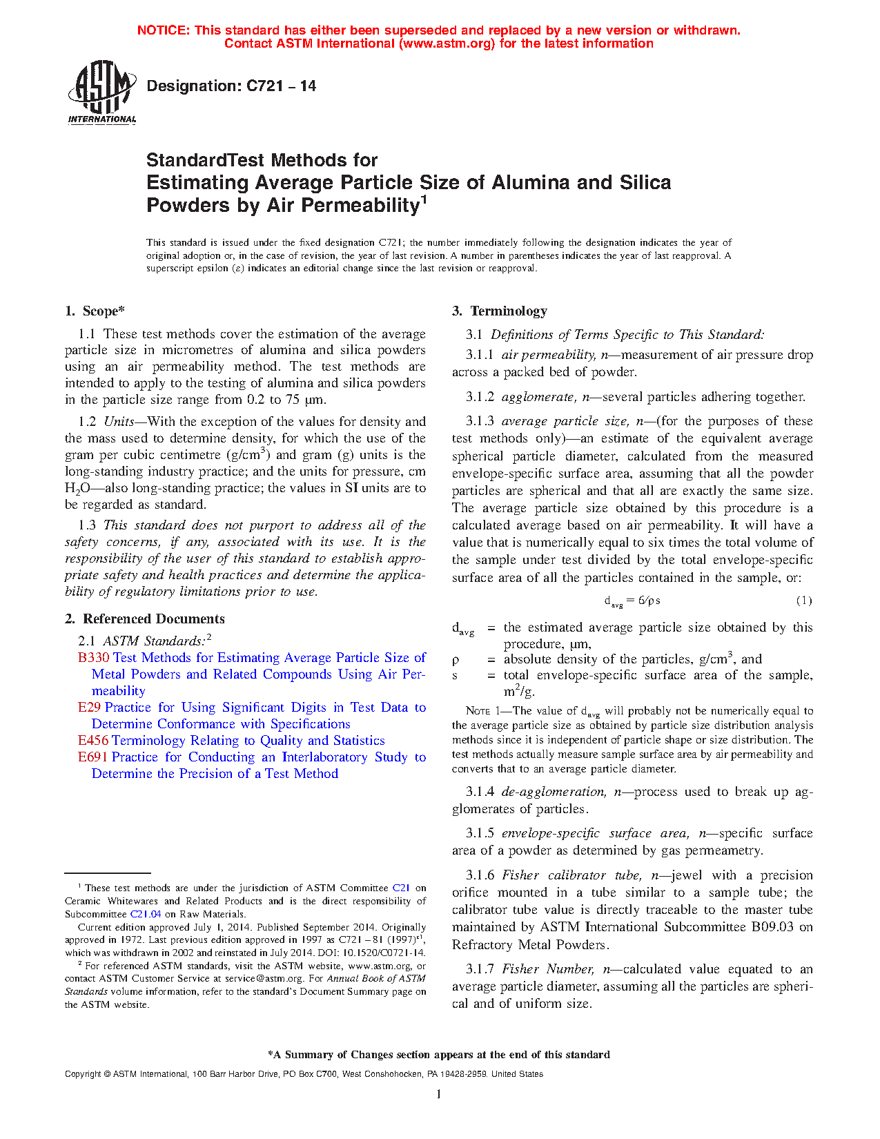 1.1 These test methods cover the estimation of the average particle size in micrometres of alumina and silica powders using an air permeability method. The test methods are intended to apply to the testing of alumina and silica powders in the particle size range from 0.2 to 75 μm.