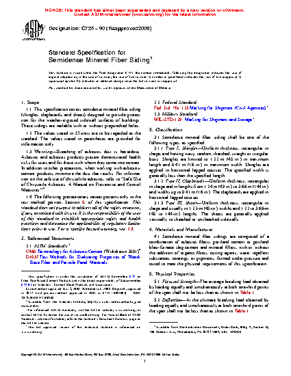 This specification covers semidense mineral fiber siding designed to provide protection for the weather-exposed sidewall surfaces of buildings. These sidings are nailable with or without prepunched holes. Fiber sidings shall be available in one of the following types: Type I (shingles); Type II (clapboards); and Type III (sheets). Products shall be sampled, tested, and conform accordingly to the following physical properties: flexural strength, deflection, water-absorption swelling, durability, density, color and finish, and nominal dimensions (width, length, and thickness).