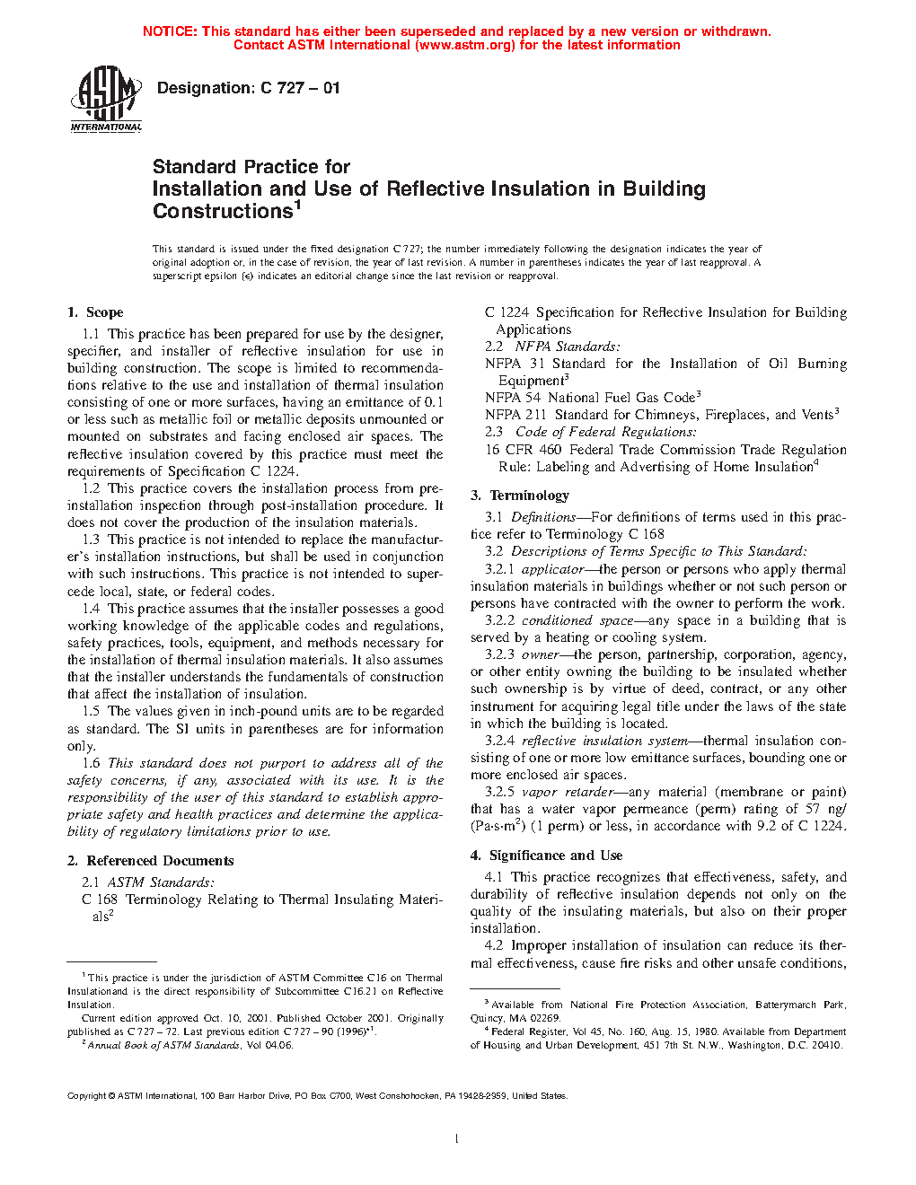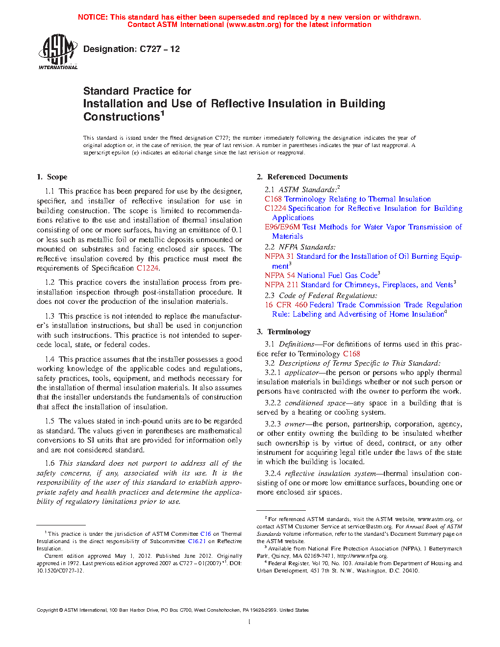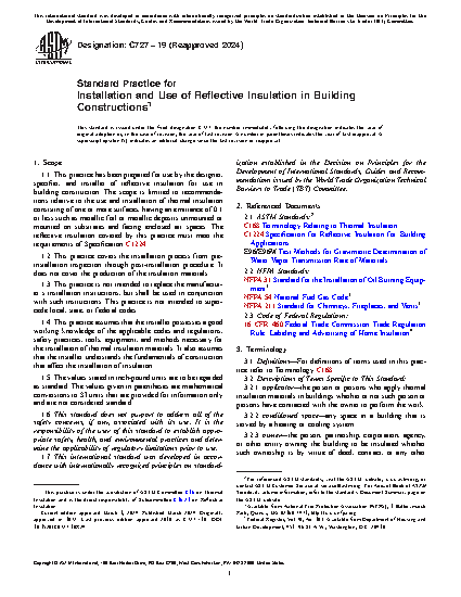 1.1 This practice has been prepared for use by the designer, specifier, and installer of reflective insulation for use in building construction. The scope is limited to recommendations relative to the use and installation of thermal insulation consisting of one or more surfaces, having an emittance of 0.1 or less such as metallic foil or metallic deposits unmounted or mounted on substrates and facing enclosed air spaces. The reflective insulation covered by this practice must meet the requirements of Specification C 1224.