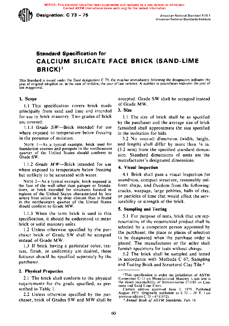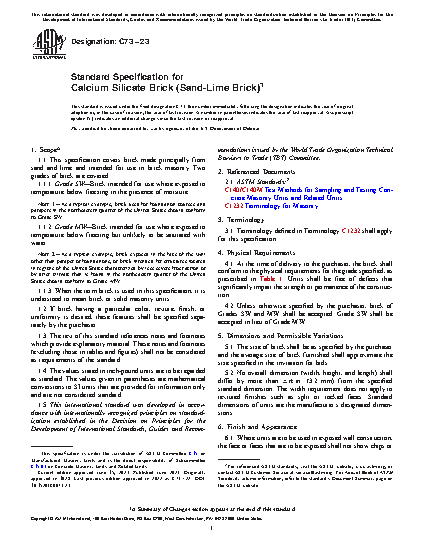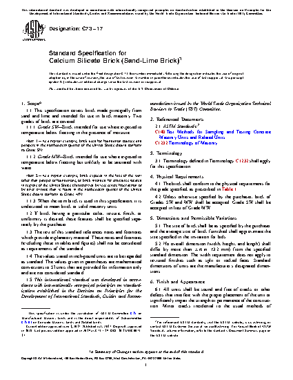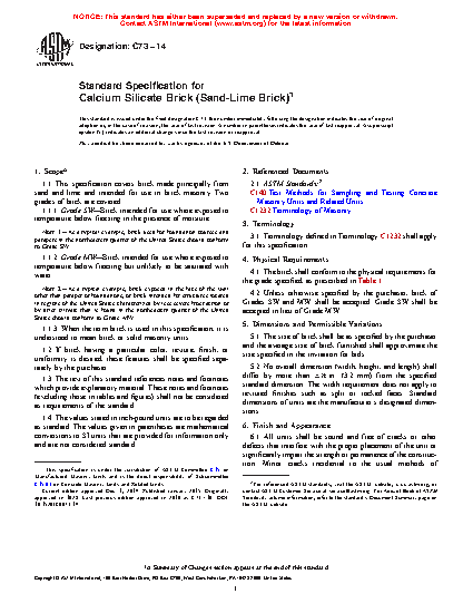 1.1 This specification covers brick made principally from sand and lime and intended for use in brick masonry. Two grades of brick are covered:
