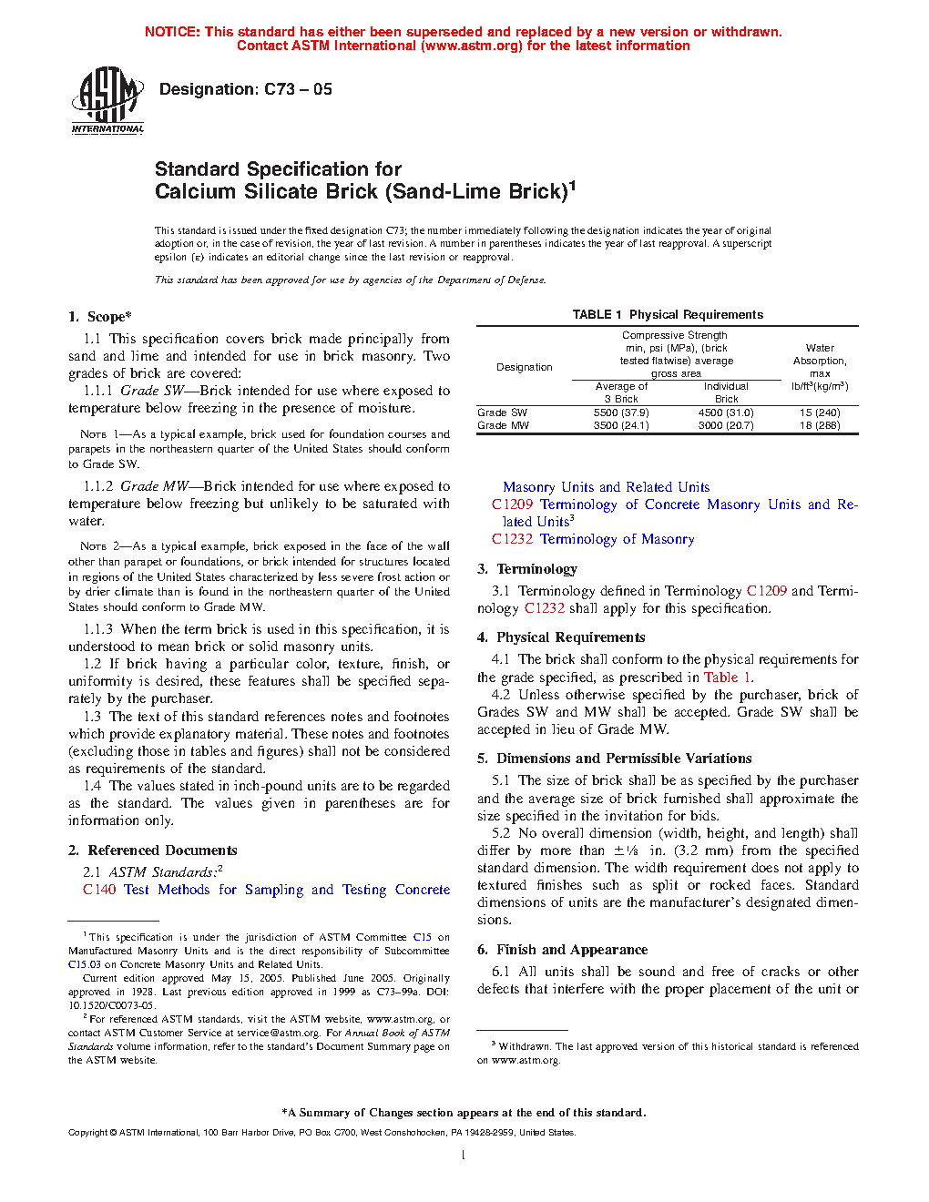 This specification covers brick made principally from sand and lime and intended for use in brick masonry. Two grades of brick are covered: grade SW - brick intended for use where exposed to temperature below freezing in the presence of moisture, grade MW - brick intended for use where exposed to temperature below freezing but unlikely to be saturated with eater. The brick shall conform to the physical requirements for the grade specified, as prescribed. All units shall be sound and free of cracks or other defects that interfere with the proper placement of the unit or significantly impair the strength or permanence of the construction.