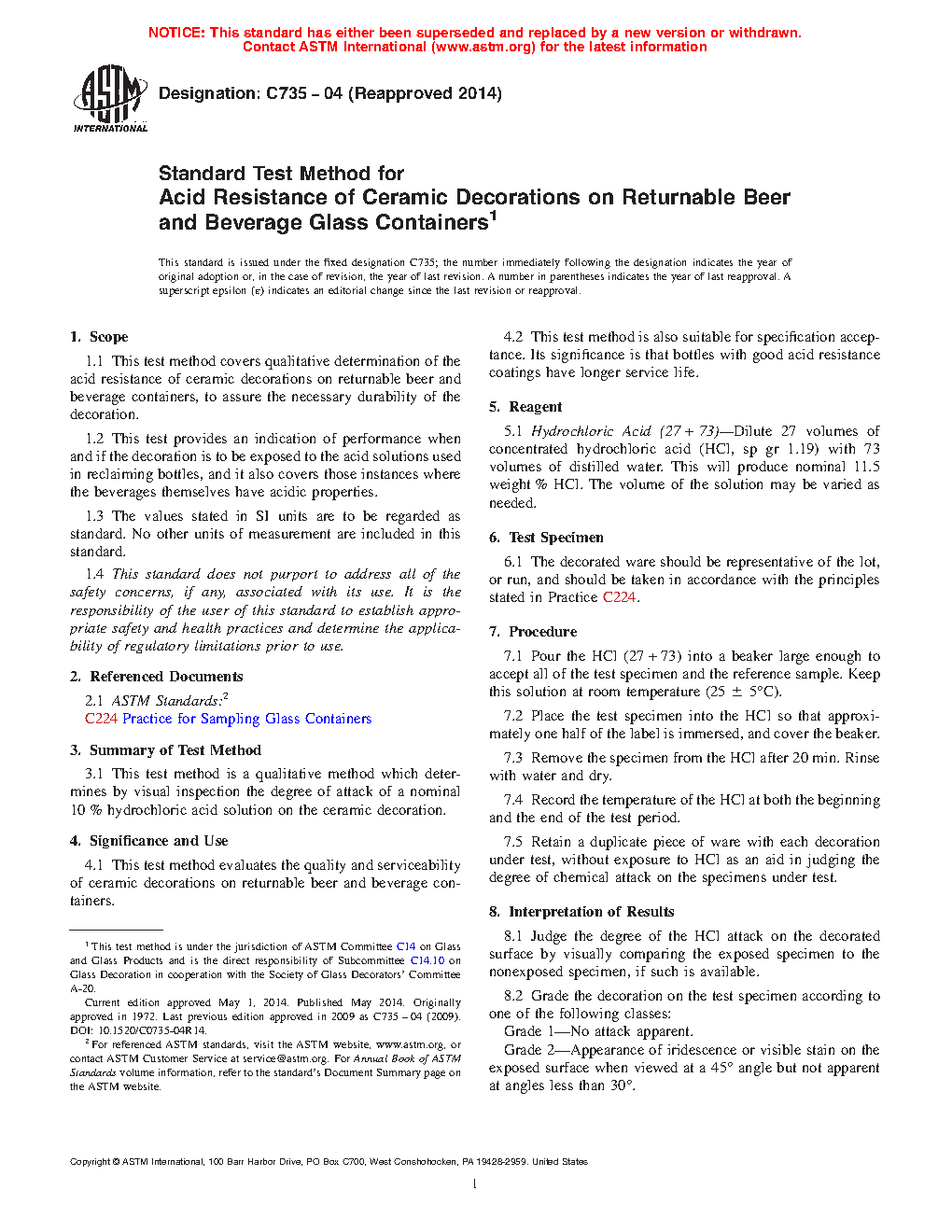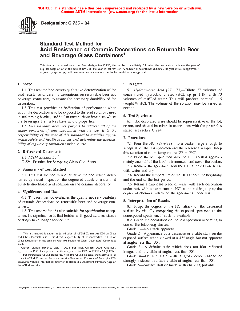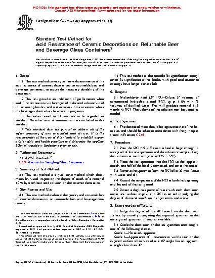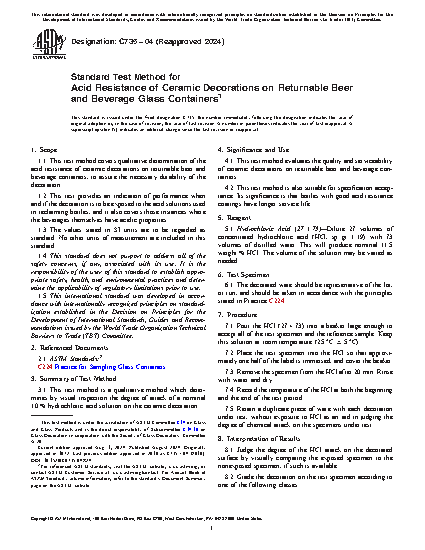 1.1 This test method covers qualitative determination of the acid resistance of ceramic decorations on returnable beer and beverage containers, to assure the necessary durability of the decoration.