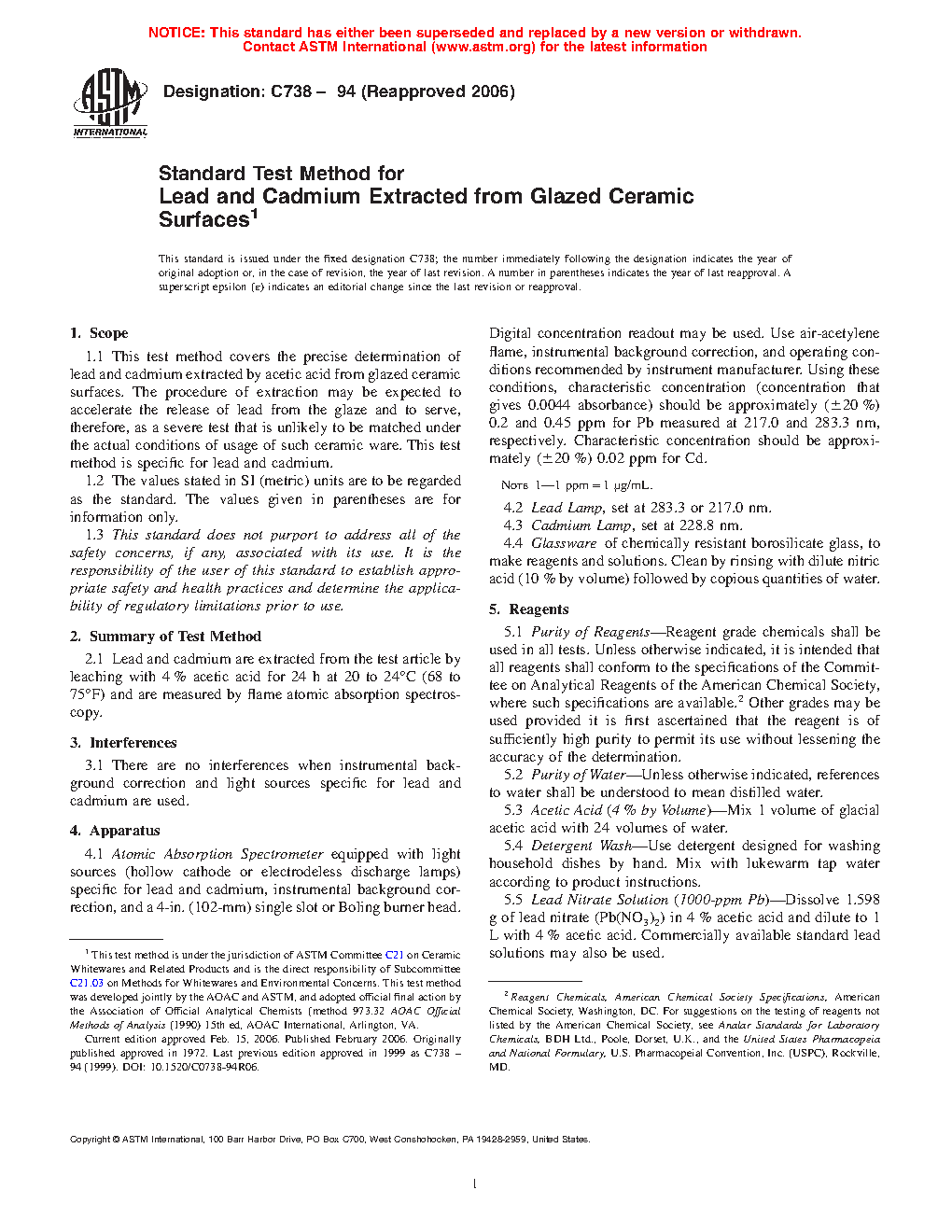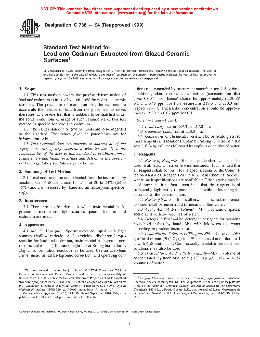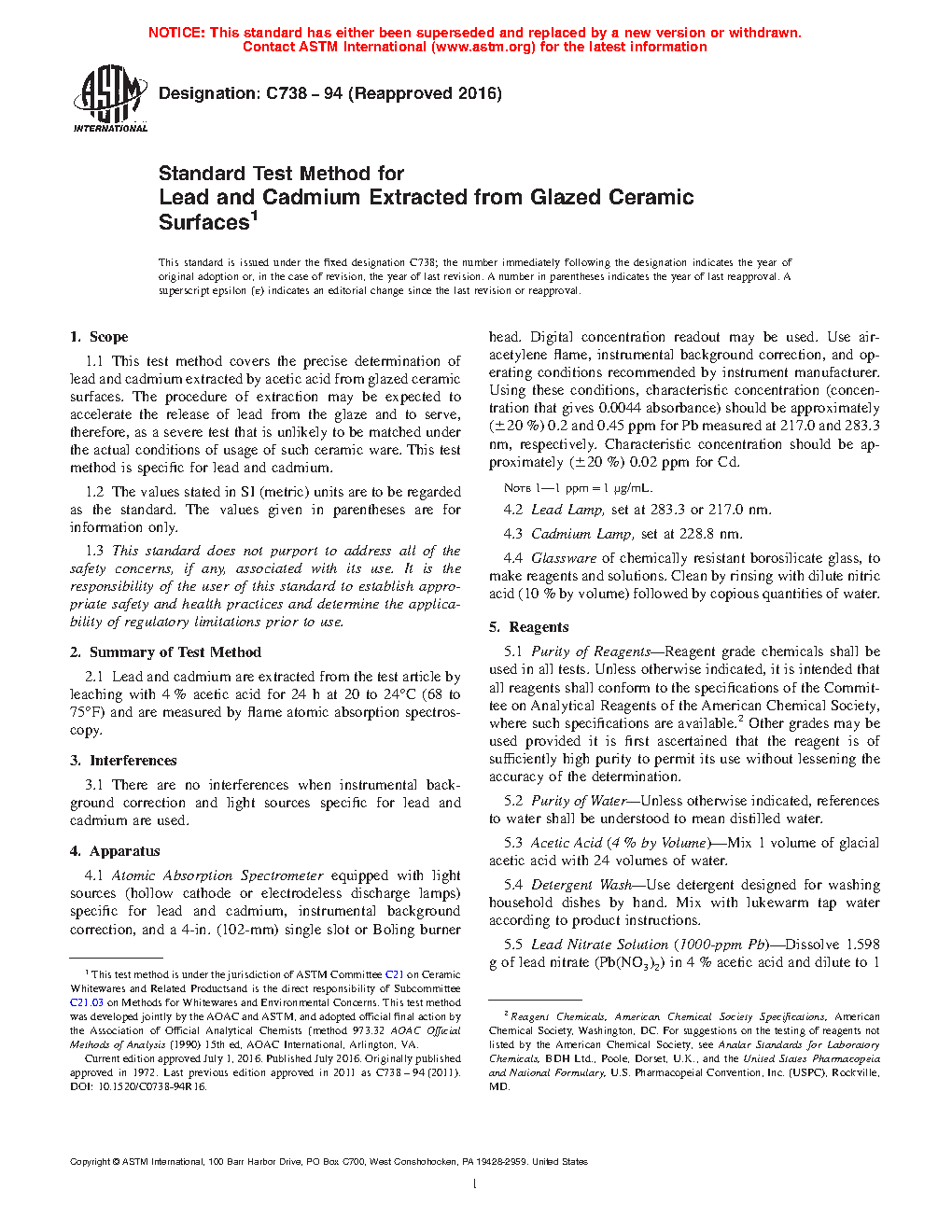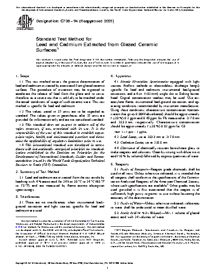 1.1 This test method covers the precise determination of lead and cadmium extracted by acetic acid from glazed ceramic surfaces. The procedure of extraction may be expected to accelerate the release of lead from the glaze and to serve, therefore, as a severe test that is unlikely to be matched under the actual conditions of usage of such ceramic ware. This test method is specific for lead and cadmium.