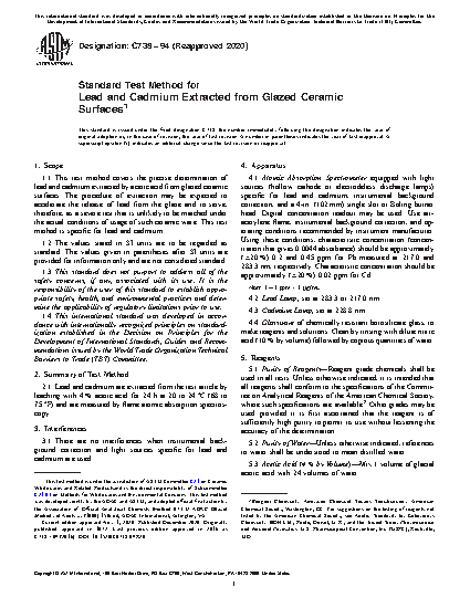 This test method details the standard and precise procedures for the determination of lead and cadmium extracted by acetic acid from glazed ceramic surfaces. The apparatus needed for this procedure include an atomic absorption spectrometer, lead and cadmium lamps, and glassware of chemical resistant borosilicate glass. The water, detergent wash, and reagents such as acetic acid, lead nitrate solution, hydrochloric acid, and cadmium solution should conform to chemical purity specified. Measurement procedures, precision, and bias are discussed thoroughly.
